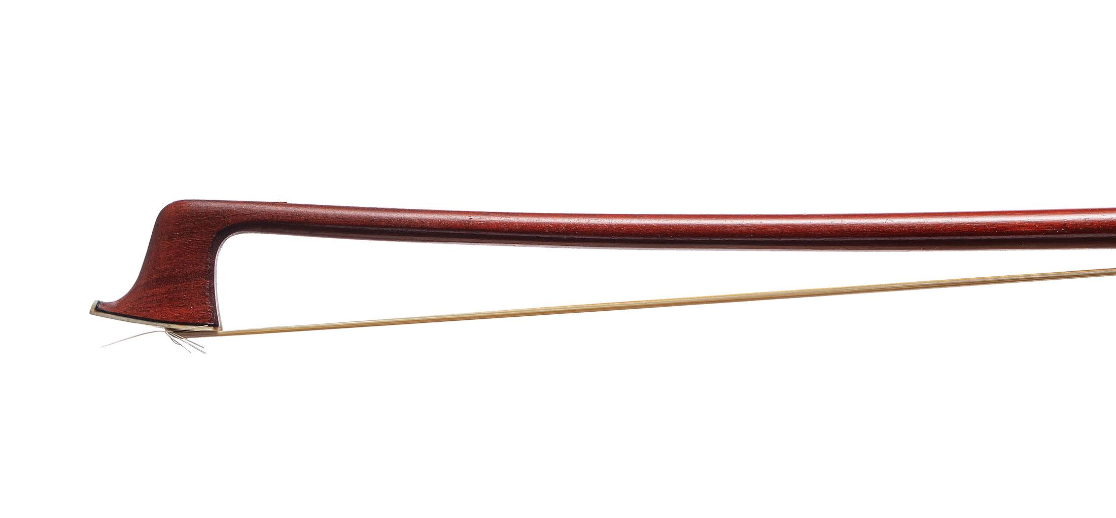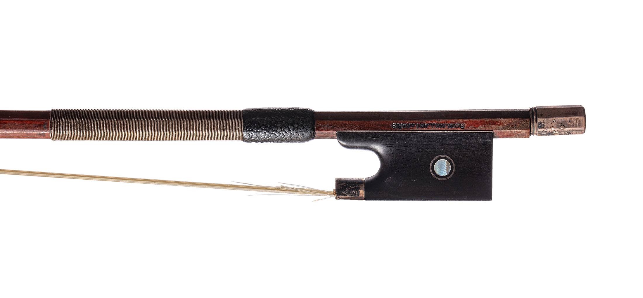 French violin bow by MILLANT bearing the stamp "R&M MILLANT A PARIS". Crack.