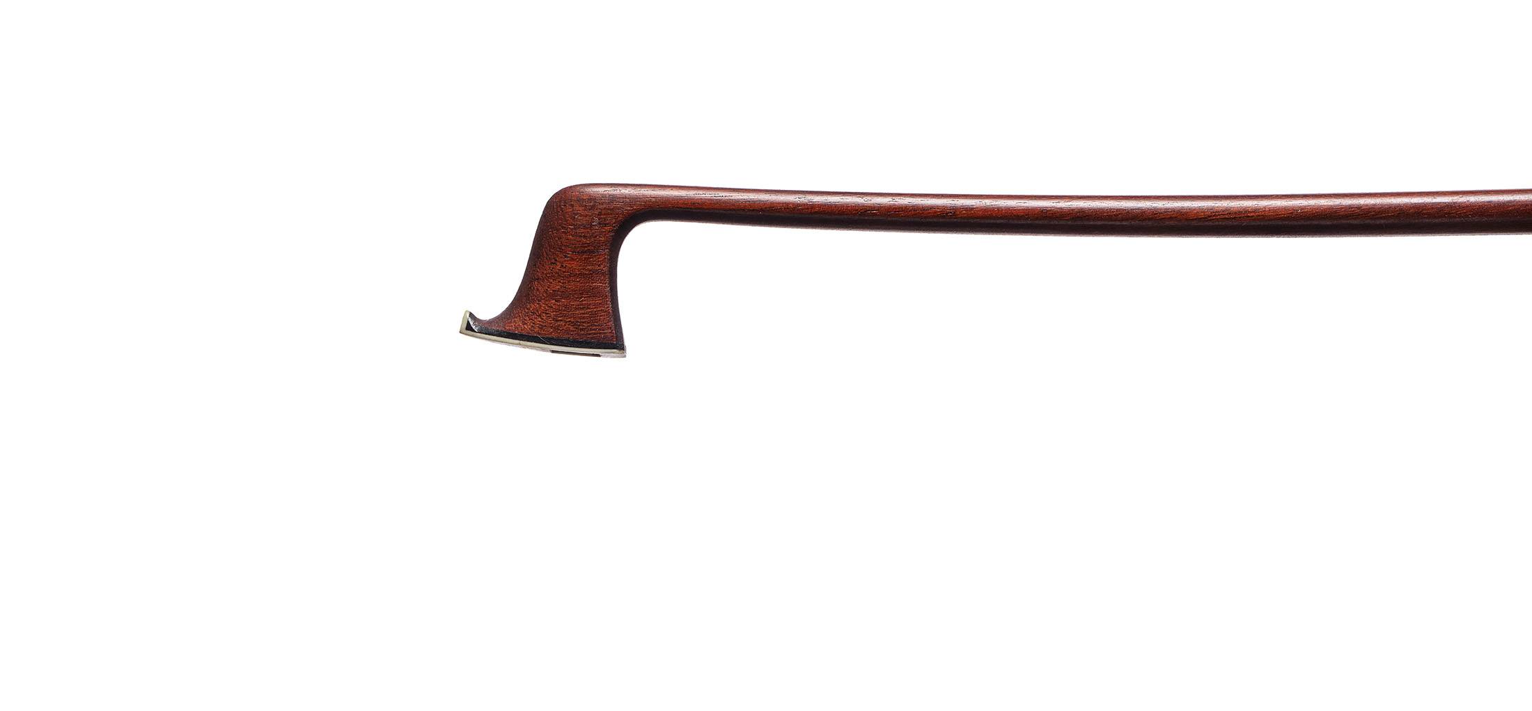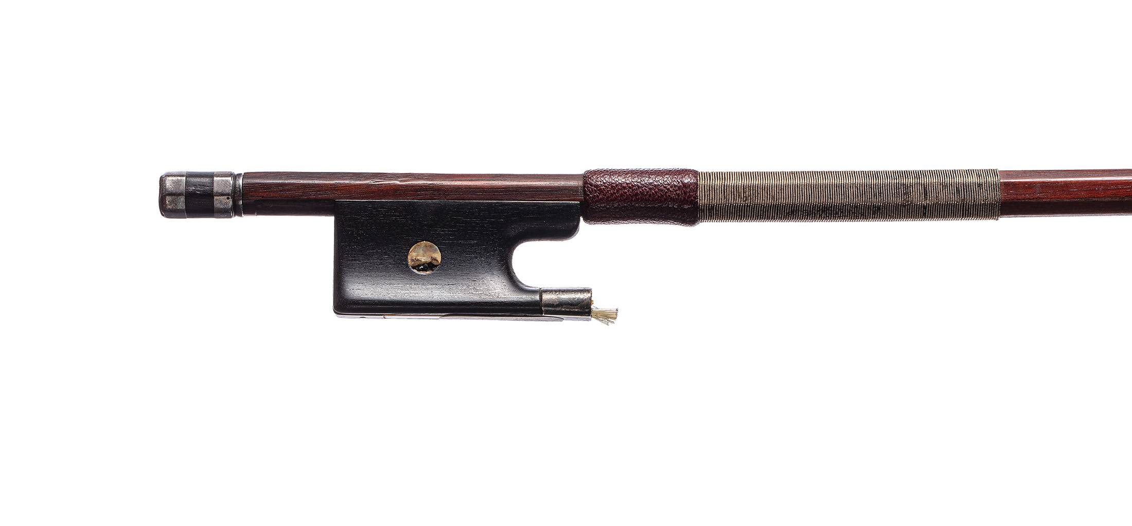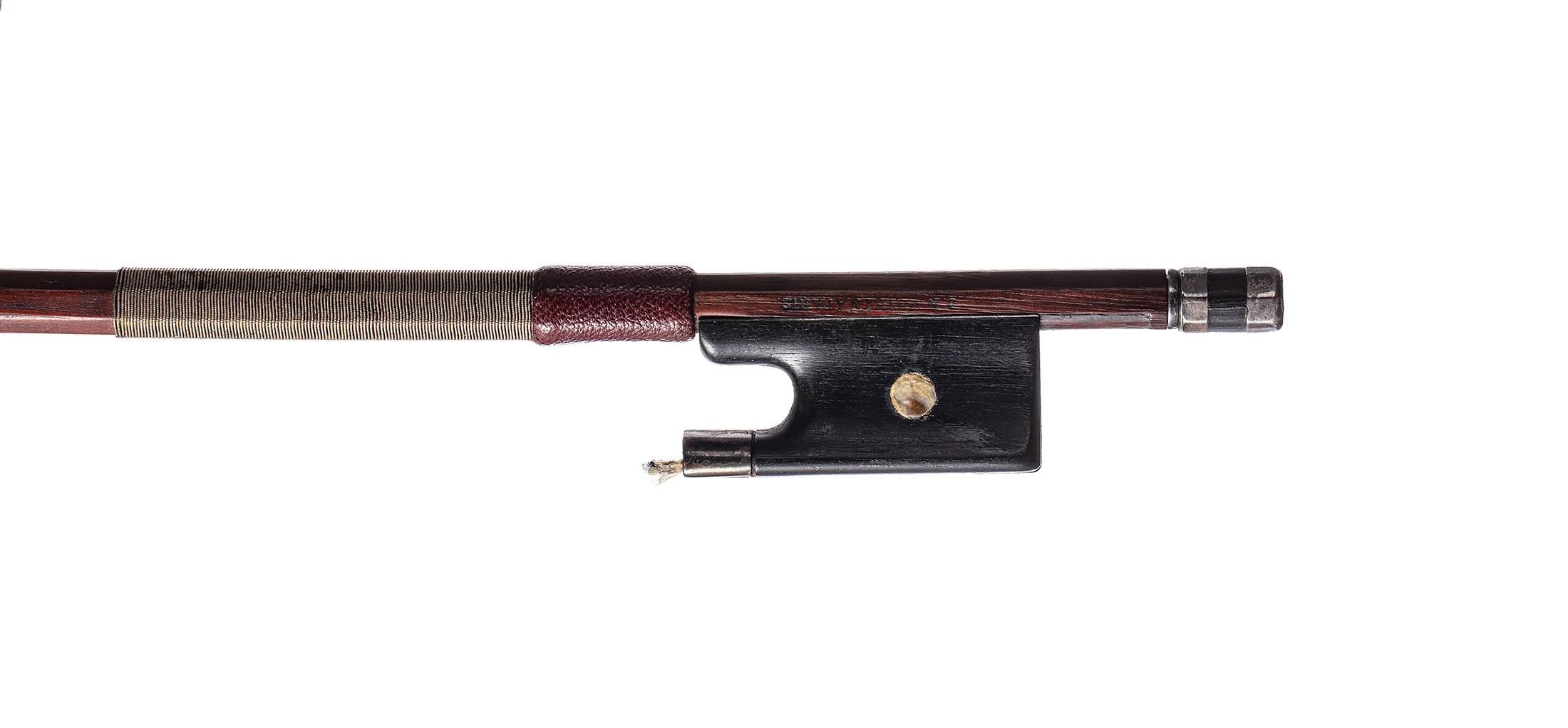 font il porte la marque au fer "FN VOIRIN A PARIS". Baguette ronde en bois de pernambouc. Hausse modèle VUILLAUME, ébène montée argent. Bouton de trois pièces. 51g sans mèche et garniture argent sur soie. Légères usures au pan et à l'emplacement du pouce. 731 mm.