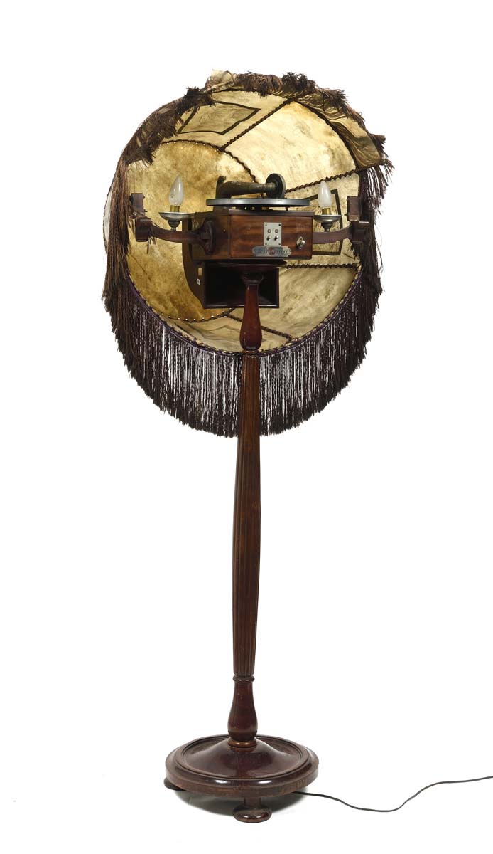 Grand lampadaire avec abat-jour en parchemin dissimulant un phonographe à moteur électrique dont le pavillon est en acajou.