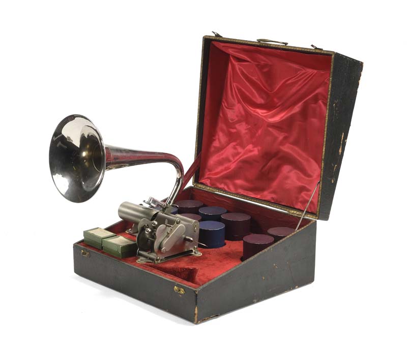 Graphophone COQ dit « BOITE NECESSAIRE » présenté dans sa boite qui contient un appareil n° 25, un reproducteur PATHE, un enregistreur, des cylindres et un pavillon « COR de CHASSE ».