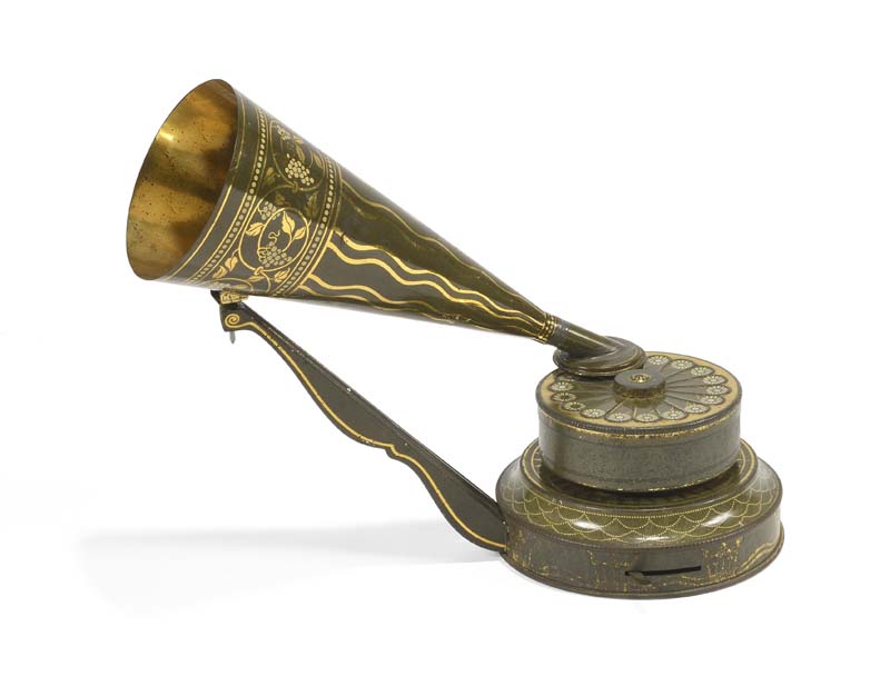 Jouet d’enfant figurant un phonographe mécanique en tôle lithographiée à décors de grappes et guirlandes. Fonctionne également avec des disques en chocolat. Présenté avec sa boite d’origine et quelques disques.