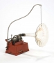 Phonographe à cylindres avec caisse en fonte peinte en rouge et pavillon de cristal soutenu par une tige en métal pour compenser le poids du pavillon.