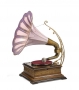 Grand phonographe à disques très représentatif du style Art Nouveau. La potence ajourée est en laiton doré et le pavillon floral en tôle peinte. La caisse est en bois peint à guirlandes sculptées. Usures.