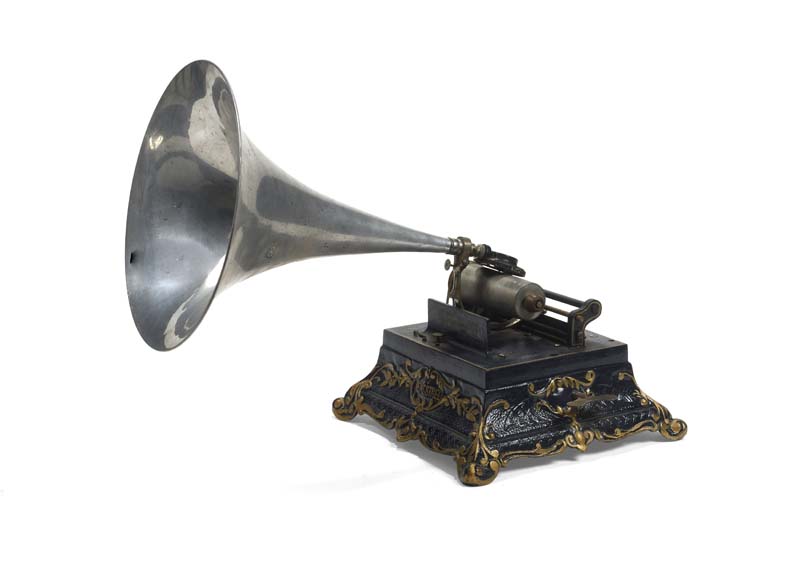 Vendu par GIRARD et Cie, ce phonographe à cylindres a la mécanique du « GAULOIS ». Base en fonte bleue et décors dorés de style Art Nouveau. Pavillon chrome. Manque le couvercle.