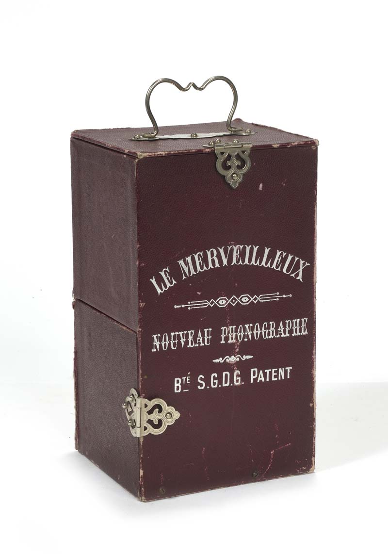 Jouet d’enfant présenté dans sa version de base en carton bordeaux de 20 cm de haut. Le couvercle se lève pour améliorer le son du résonateur. Fonctionne avec des cylindres n° 1, sur des airs de comptines, pot-pourri, clairon, piston et trompette. Nous y joignons 3 cylindres.