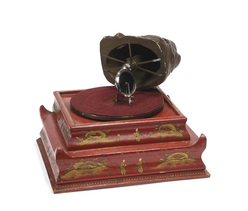 Phonographe artistique figurant un Bouddha sur une pagode. Une fois le haut enlevé, le Bouddha s’articule sur une charnière et un diaphragme approprié permet le fonctionnement de l’ensemble en laque rouge (diaphragme non d’origine).