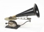 Phonographe type AU à disques, avec mouvement apparent. Un support en métal permettait de soutenir le pavillon qui était attenant à un bras ajouré en aluminium. Diaphragme mica.