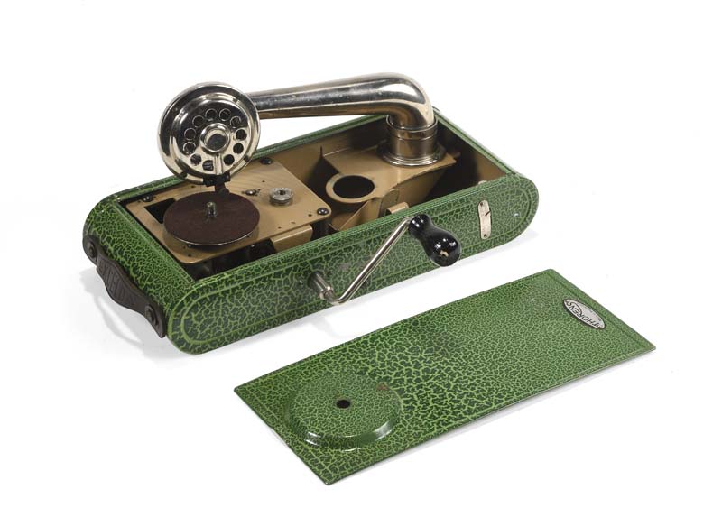 Phonographe portatif pour randonneur ou pique-nique ayant l‘apparence d’un appareil photo. Ce phonographe a un aménagement intérieur très astucieux. Diaphragme EXCELDA. Tôle peinte façon crocodile vert.
