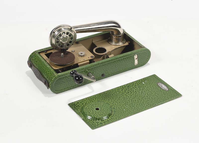 Phonographe portatif pour randonneur ou pique-nique ayant l‘apparence d’un appareil photo. Ce phonographe a un aménagement intérieur très astucieux. Diaphragme EXCELDA. Tôle peinte façon crocodile vert.