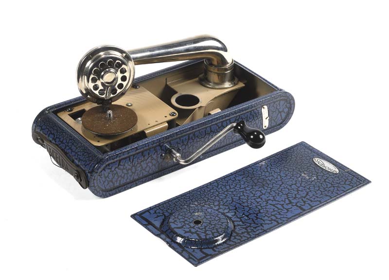 Phonographe portatif pour randonneur ou pique-nique ayant l‘apparence d’un appareil photo. Ce phonographe a un aménagement intérieur très astucieux. Diaphragme EXCELDA. Tôle peinte façon crocodile bleu.