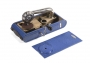 Phonographe portatif pour randonneur ou pique-nique ayant l‘apparence d’un appareil photo. Ce phonographe a un aménagement intérieur très astucieux. Diaphragme EXCELDA. Tôle peinte façon crocodile bleu.