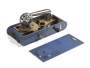 Phonographe portatif pour randonneur ou pique-nique ayant l‘apparence d’un appareil photo. Ce phonographe a un aménagement intérieur très astucieux. Diaphragme EXCELDA. Tôle peinte façon crocodile bleu.