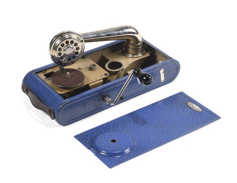 Phonographe portatif pour randonneur ou pique-nique ayant l‘apparence d’un appareil photo. Ce phonographe a un aménagement intérieur très astucieux. Diaphragme EXCELDA. Tôle peinte façon crocodile bleu.