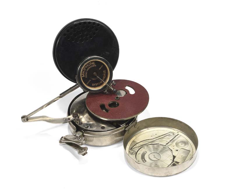Phonographe de poche qui se présente sous la forme d’une petite boite ronde de 11,5cm de diamètre. Un ingénieux agencement intérieur permet de ranger tous les accessoires. Le résonateur en celluloïd noir est en 2 parties qui s’emboitent. Plateau de 10 cm de diamètre permettant de fixer les disques par l’intermédiaire d’un axe central.