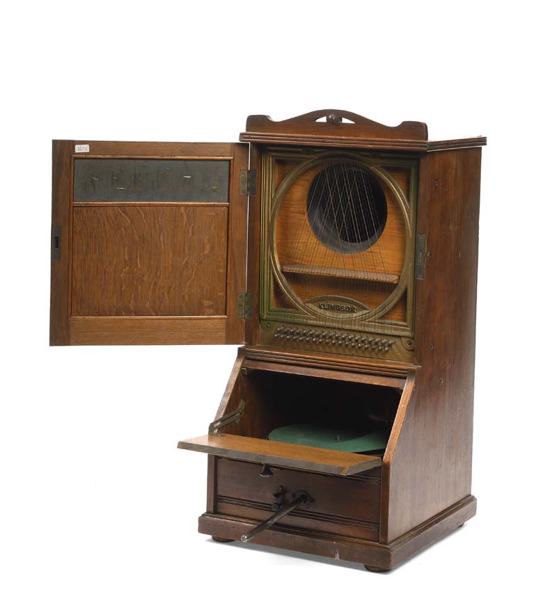 C’est en Angleterre que furent brevetés les premiers Phonographes équipés d’une cithare située à la sortie du pavillon. Les cordes vibrent au son qui les atteint.