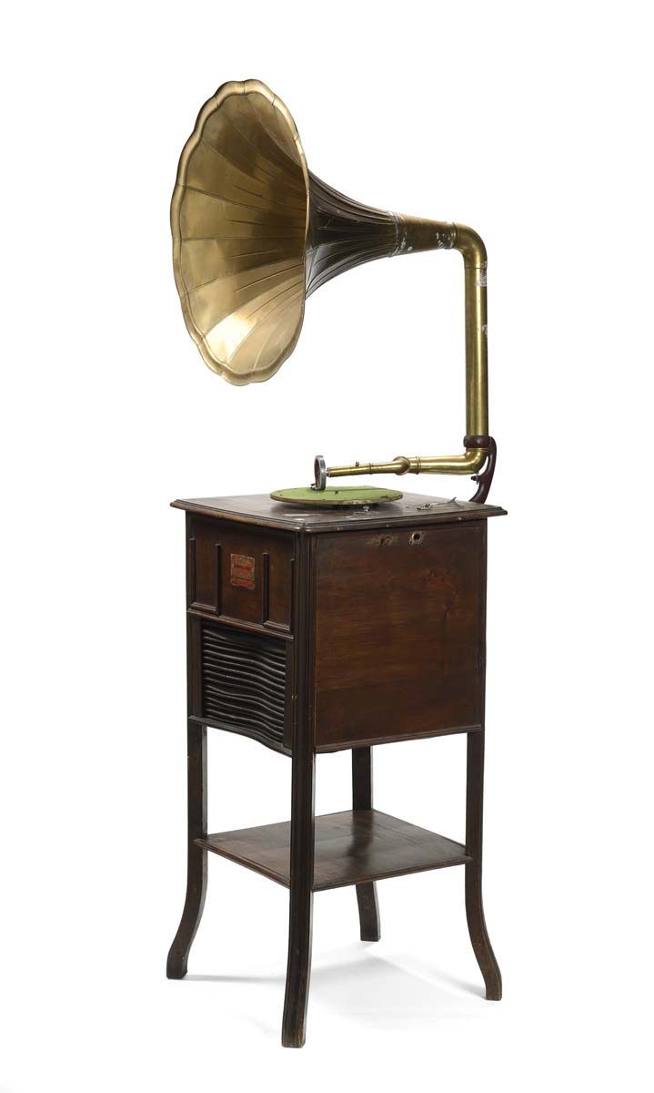 Meuble phonographe à monnayeur avec réserve de disques dans la partie basse. Grand pavillon floral en laiton. Ce modèle fut vendu par A. ANGELIQUE à JUVISY/ORGE. Diaphragme vertical le RAMOPHONE.