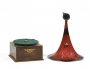 Fabriqué à Sainte Croix en Suisse, le BIJOU est un petit Phonographe dont le pavillon floral est en tôle peinte. Système de remontage sous le plateau.