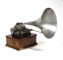 Phonographe PATHE à cylindres de taille STENTOR. Socle en fonte noire à rehauts dorés. Equipé du système VERITE pour assurer la bonne marche du pavillon avec le diaphragme PATHE. Traces de vers.