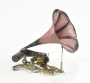 Phonographe à cylindres avec socle en fonte en forme de sirène avec pavillon rose et noir en tôle peinte. De fabrication allemande, ce phonographe était vendu en France où les couleurs de pavillons étaient adaptées. Cylindre standard et petit diaphragme plat. Légers accidents.