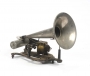 Phonographe avec socle en fonte figurant une lyre avec un pavillon et un large diaphragme en aluminium. Joue des cylindres standard.