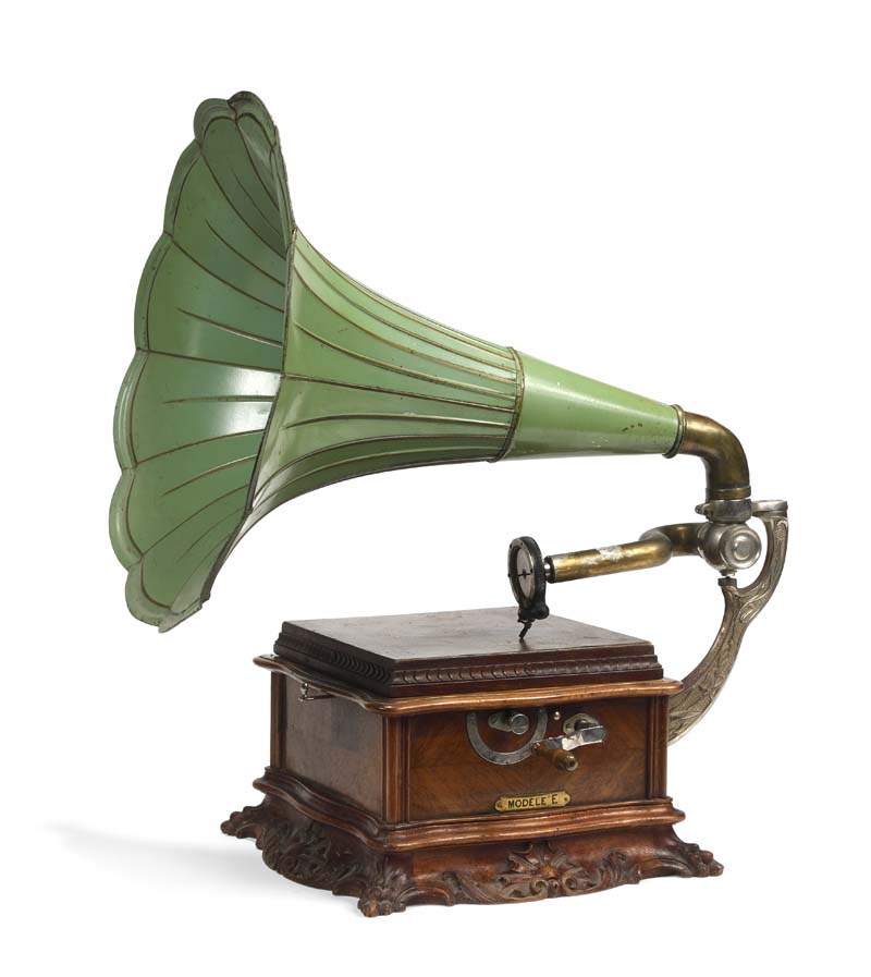 Phonographe à disques MODELE E, avec caisse en bois dont le couvercle est marqué du COQ. Sculptures de style Louis XV. Pavillon métal peint en vert. Diaphragme PATHE.