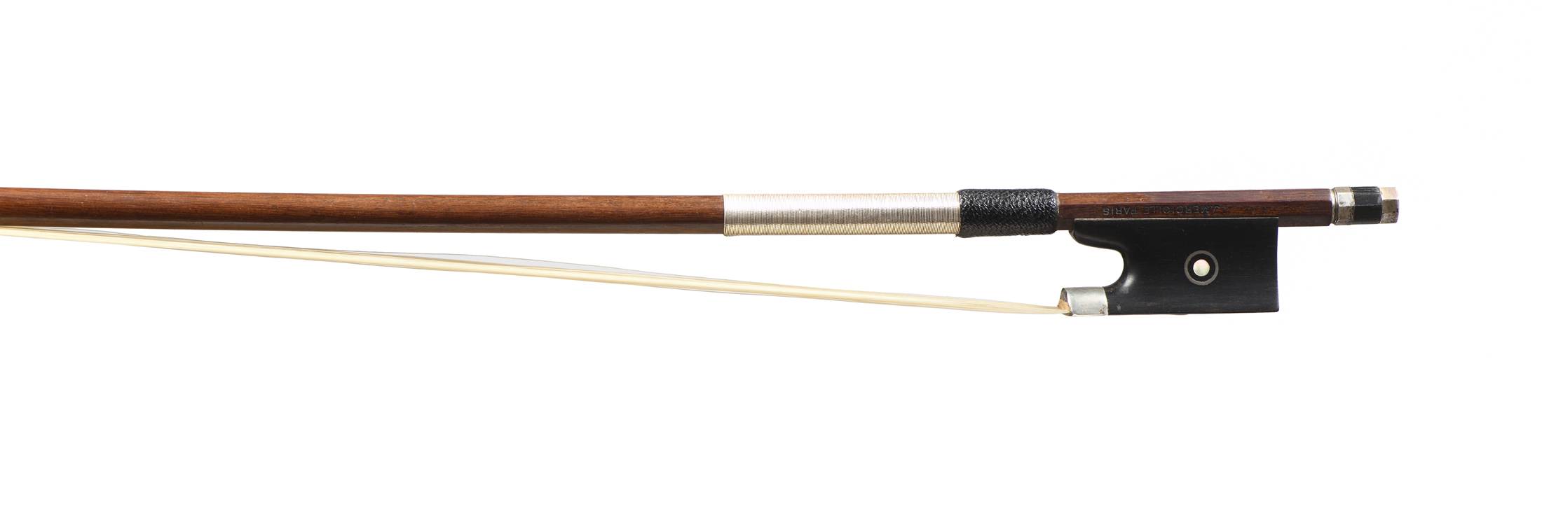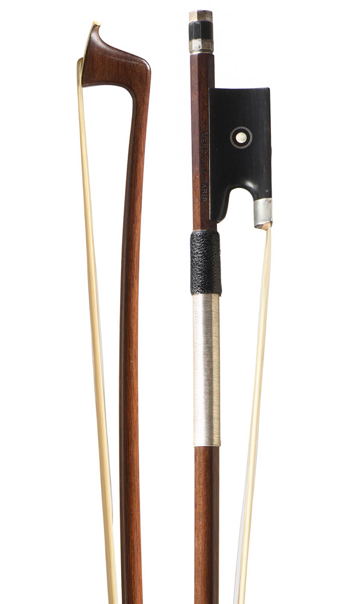 fait par Louis Joseph Morizot père, dit "MORIZOT père", portant la marque au fer "J.MERCIOLLE PARIS". Baguette ronde en bois de pernambouc. Hausse ébène. Monté maillechort. Grain cerclé.