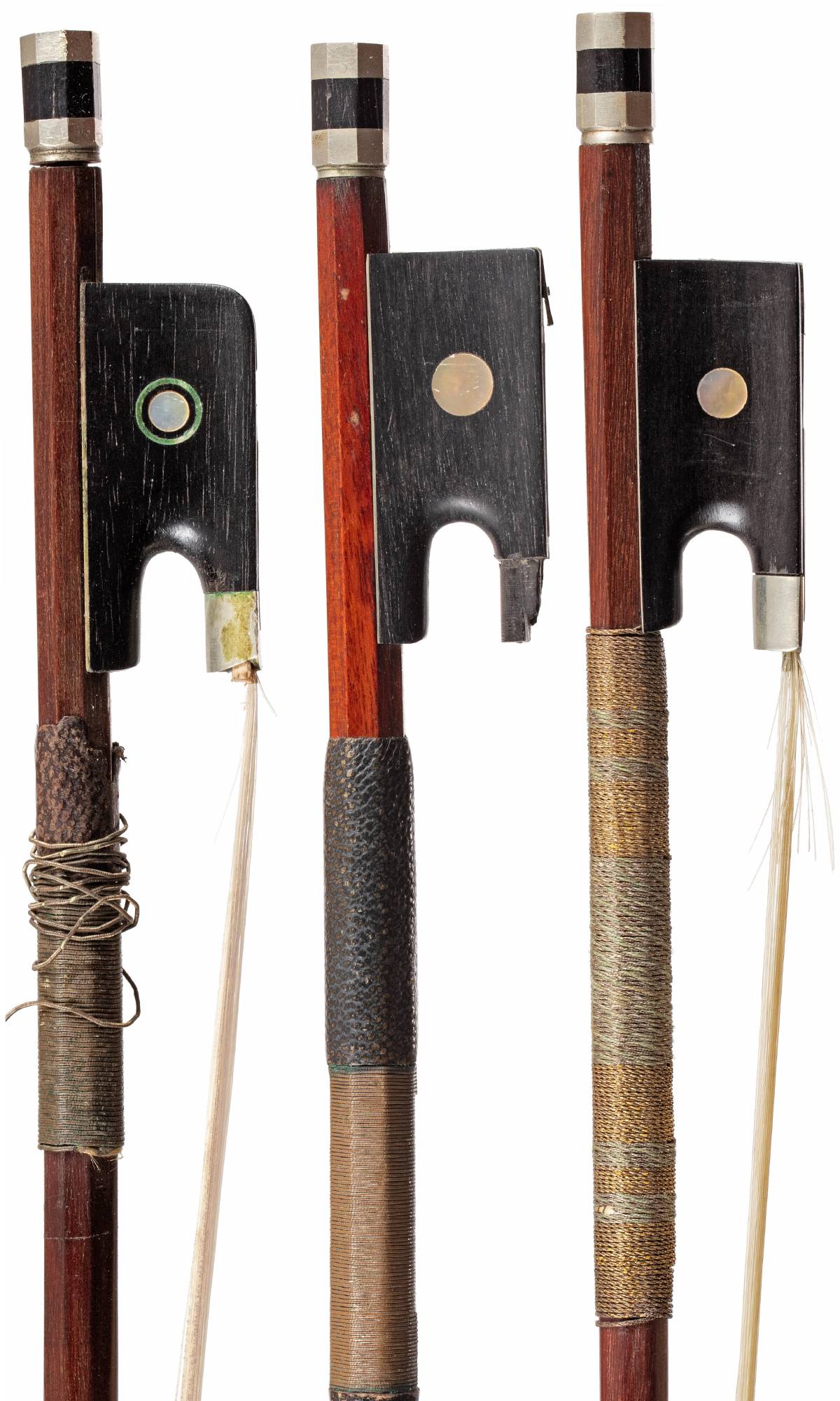 Lot de trois archets MIRECOURT dont un en pernambouc, probablement des ateliers PROSPER COLAS.