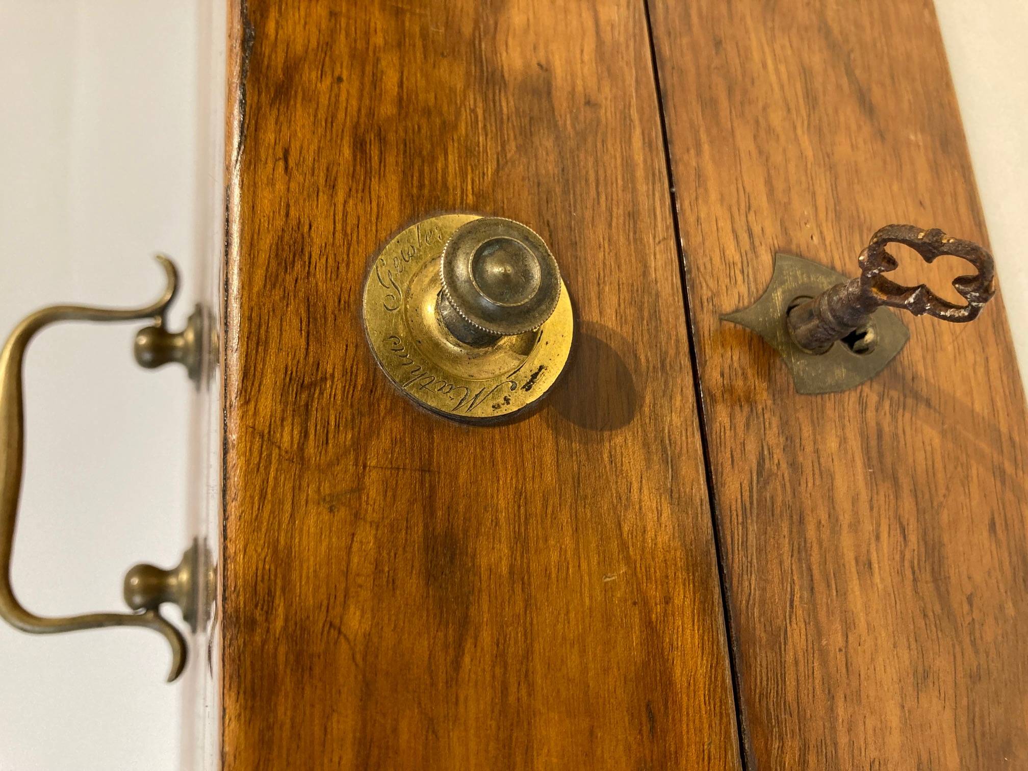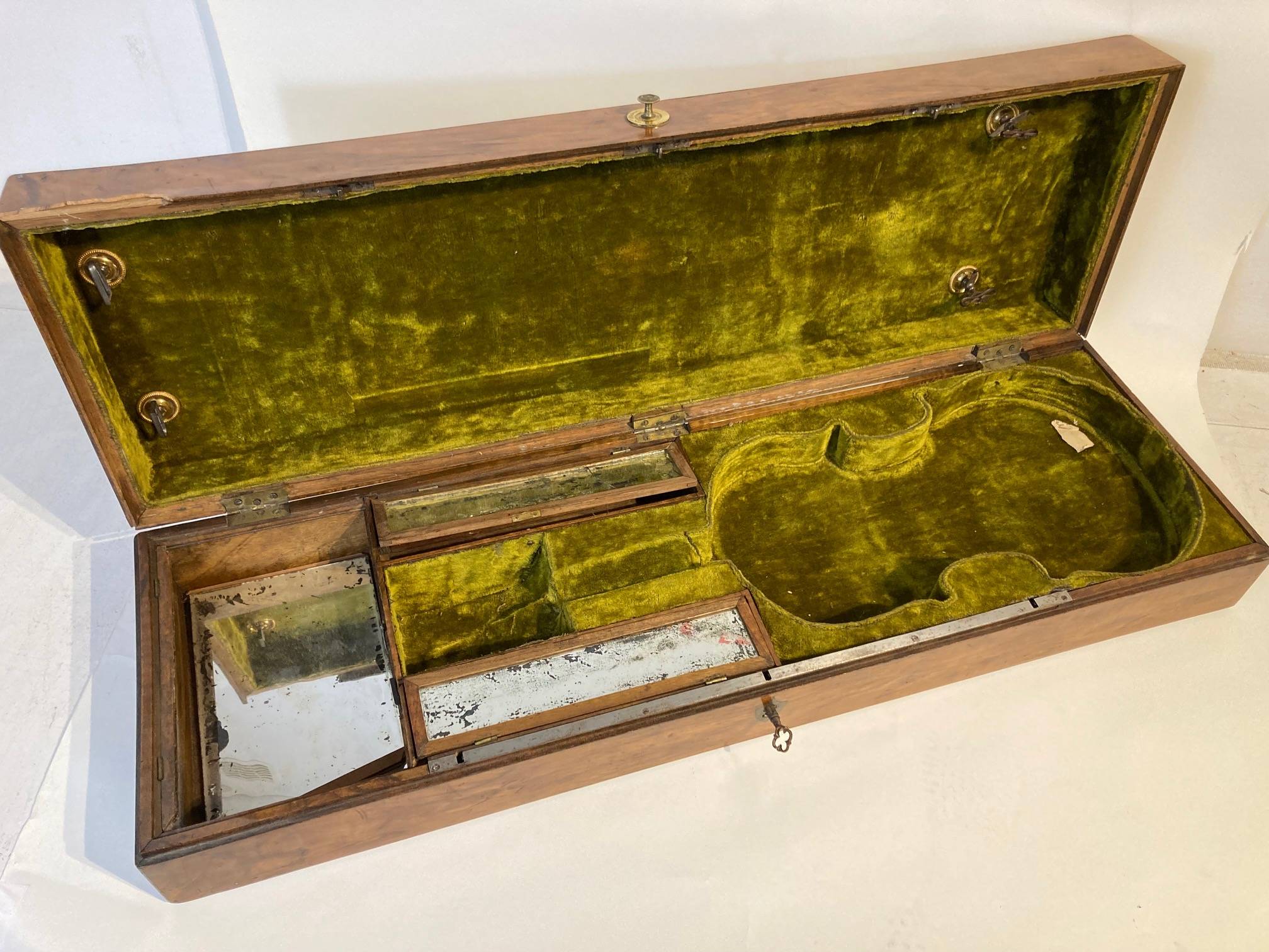 Bel étui de table rectangulaire portant la marque "Mathias GEISLER". Intérieur en velour vert. Couvercle de rangements en miroirs à restaurer. L'ensemble à restaurer.