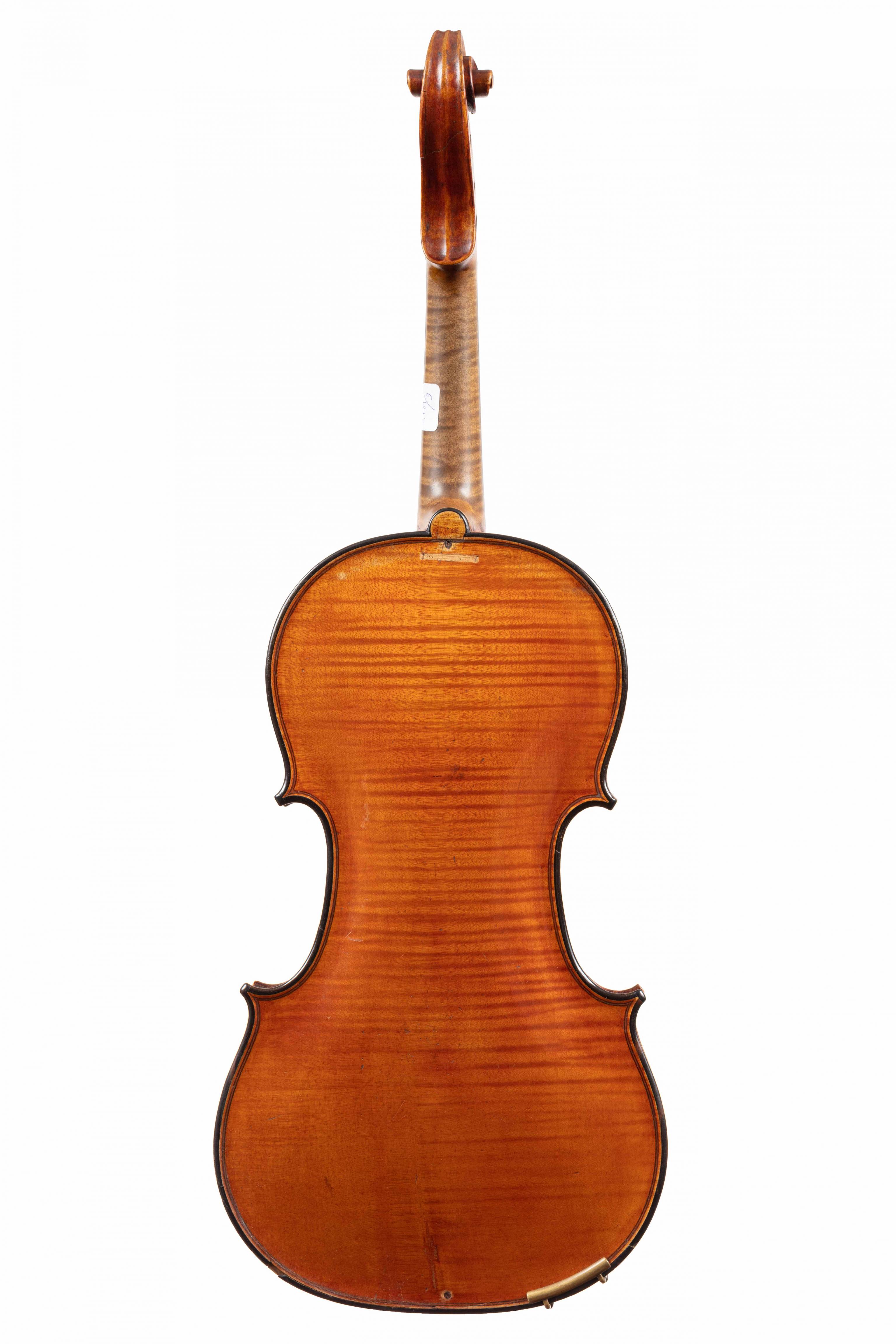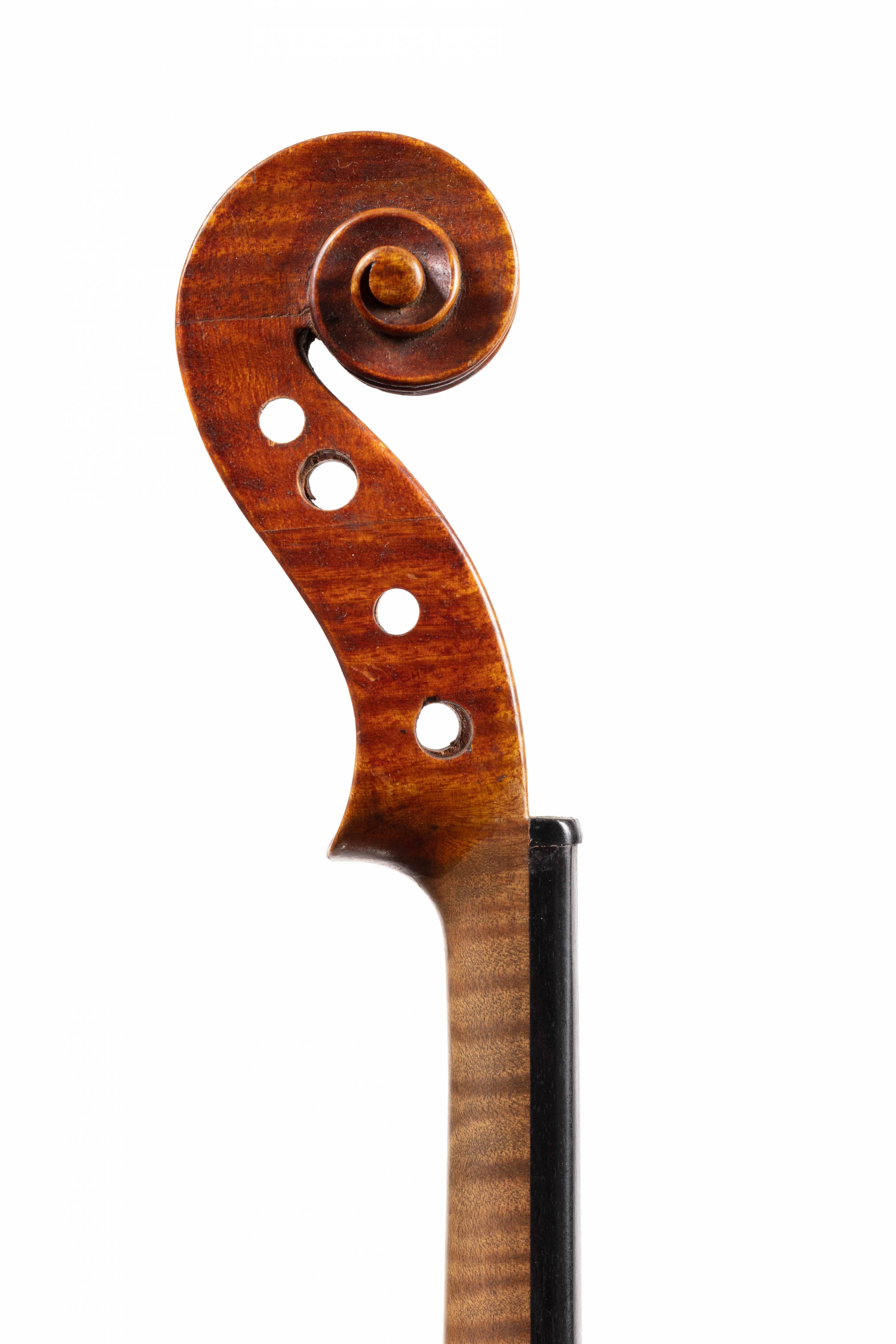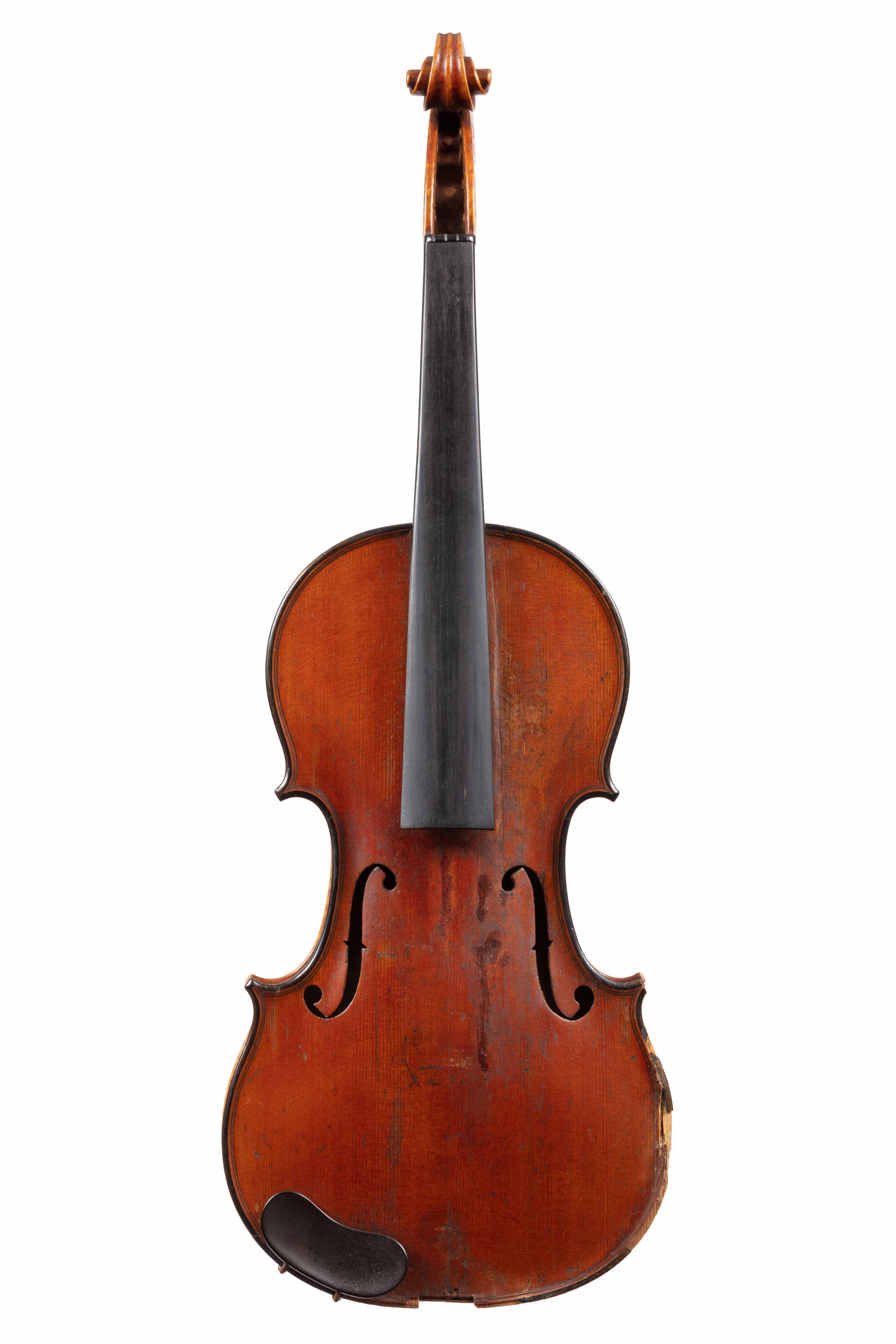Fait au début du XIXe. Fond d'une pièce en érable. Vernis brun doré. Table en épicéa. Diverses cassures de table à restaurer. Marque sous le talon du manche retirée. 361 mm.