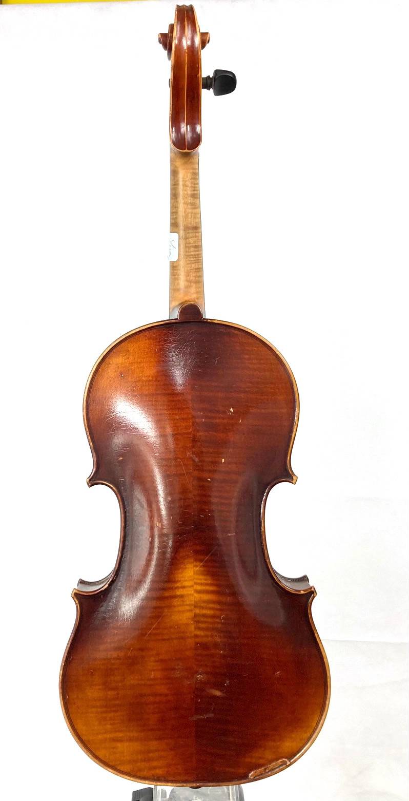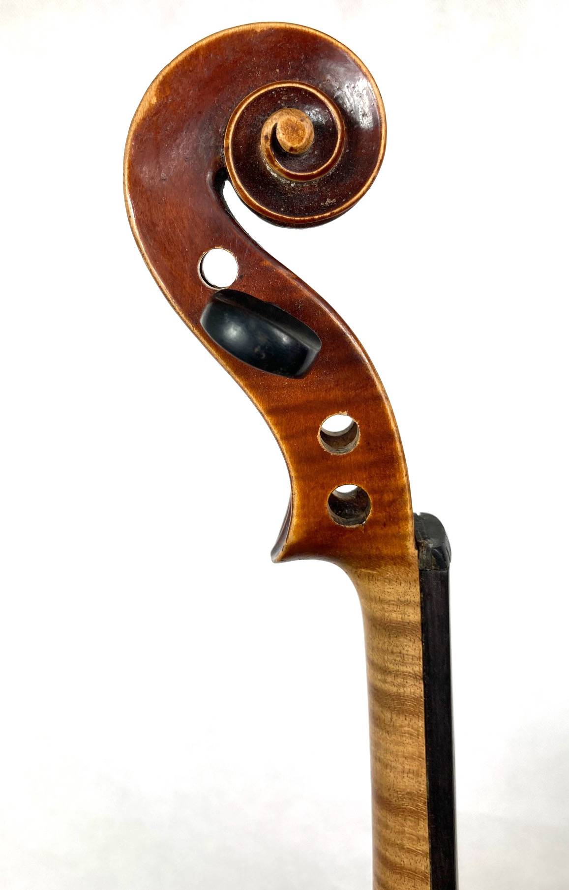 portant une étiquette apocryphe "Léon Mougenot Gauché...". Fond de deux pièces en érable en bel érable aux ondes moyennes et régulières. Table en épicéa aux pores plutôt serrés. Vernis brun rouge sur fond doré. 357 mm. Manques à la tête.