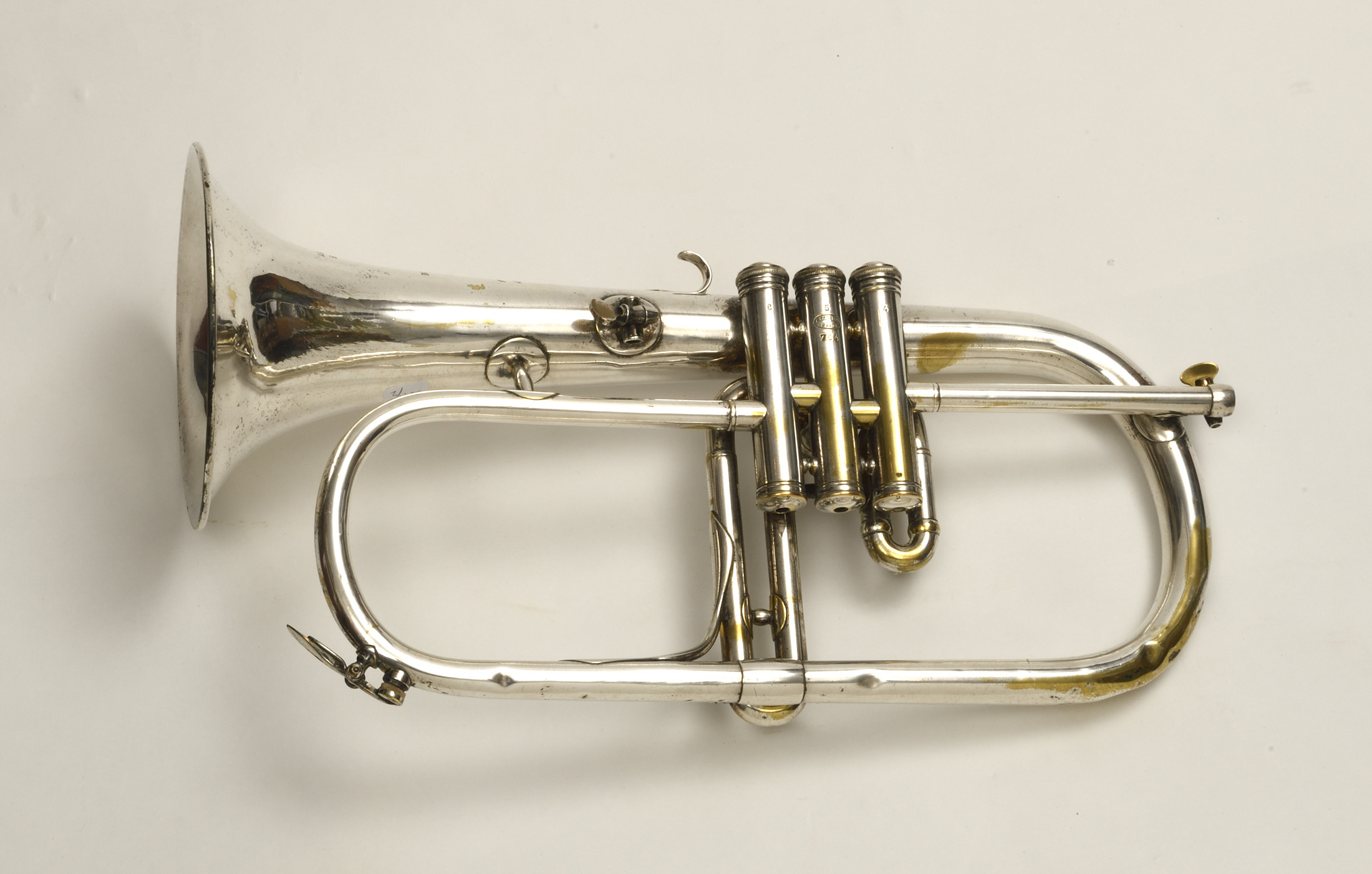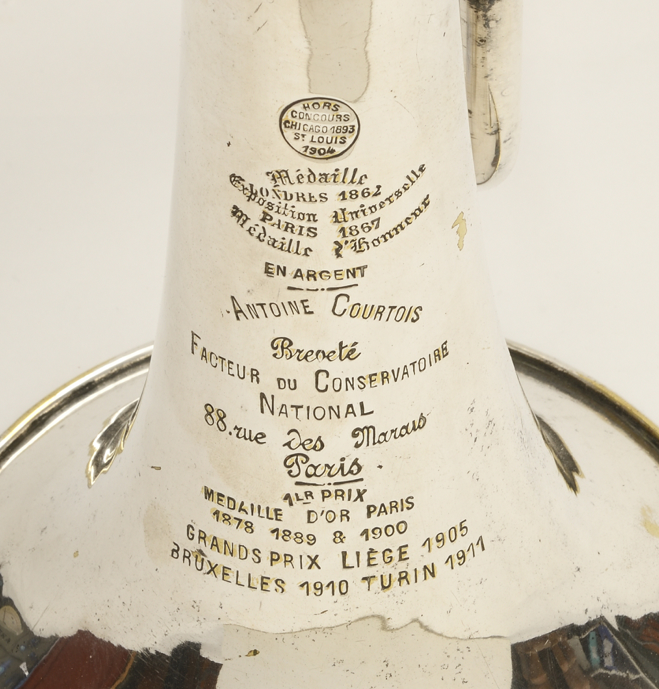 Bugle en métal argenté par Antoine COURTOIS, dont il porte la marque "Antoine COURTOIS Breveté...". Trois pistons manquant. Numéros 6 5 4 et 764 sur les pistons.