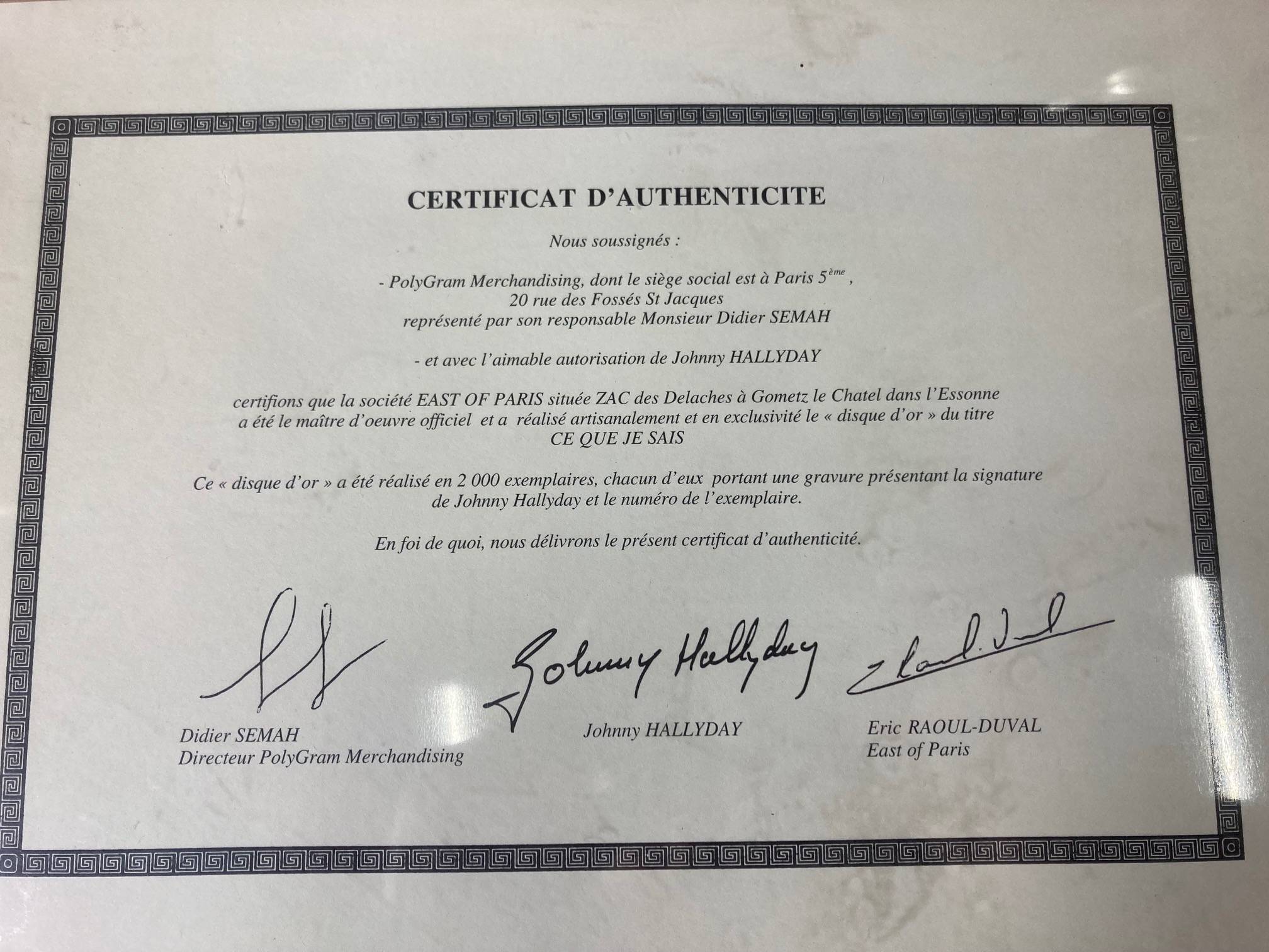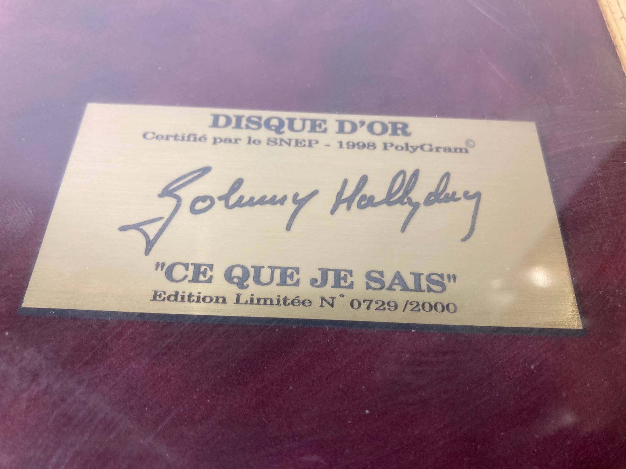 Disque d'or de Johnny Hallyday de l'album "Ce que je sais". Avec certificat d'authenticité au dos. N°0729/2000.