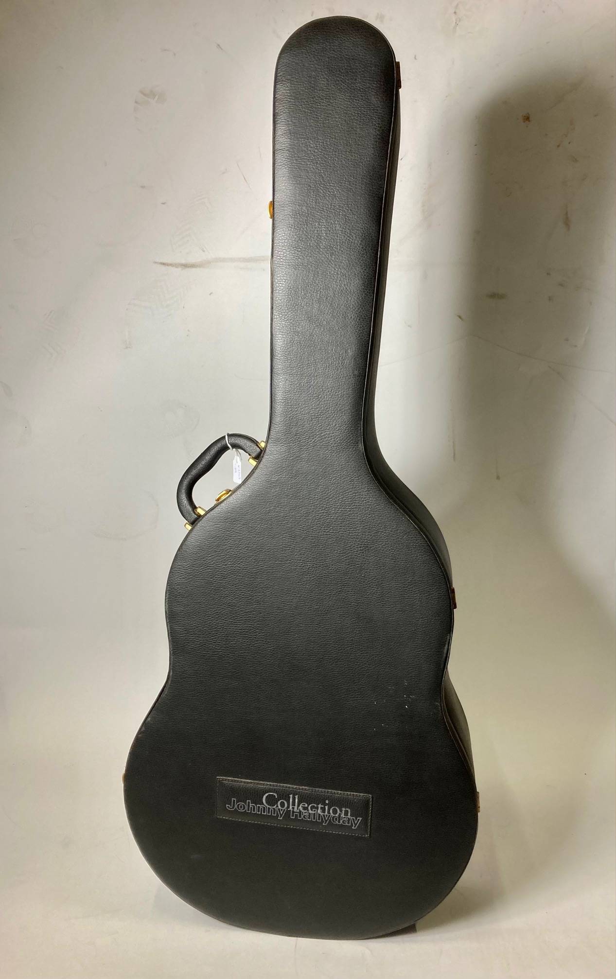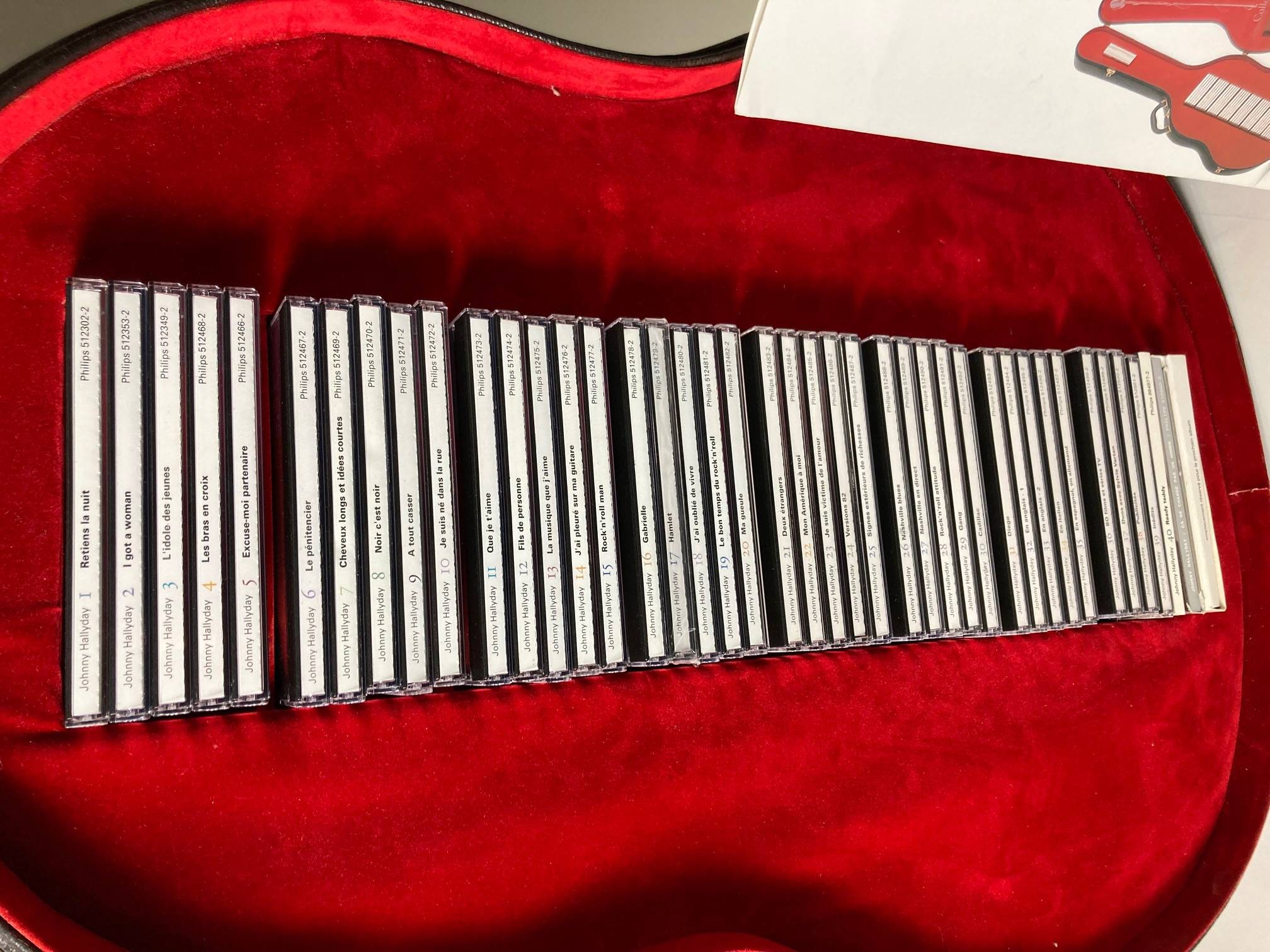 Important coffre de guitare comprenant 40 cds des albums de Johnny Hallyday. Complet. Petites usures sur la boite.