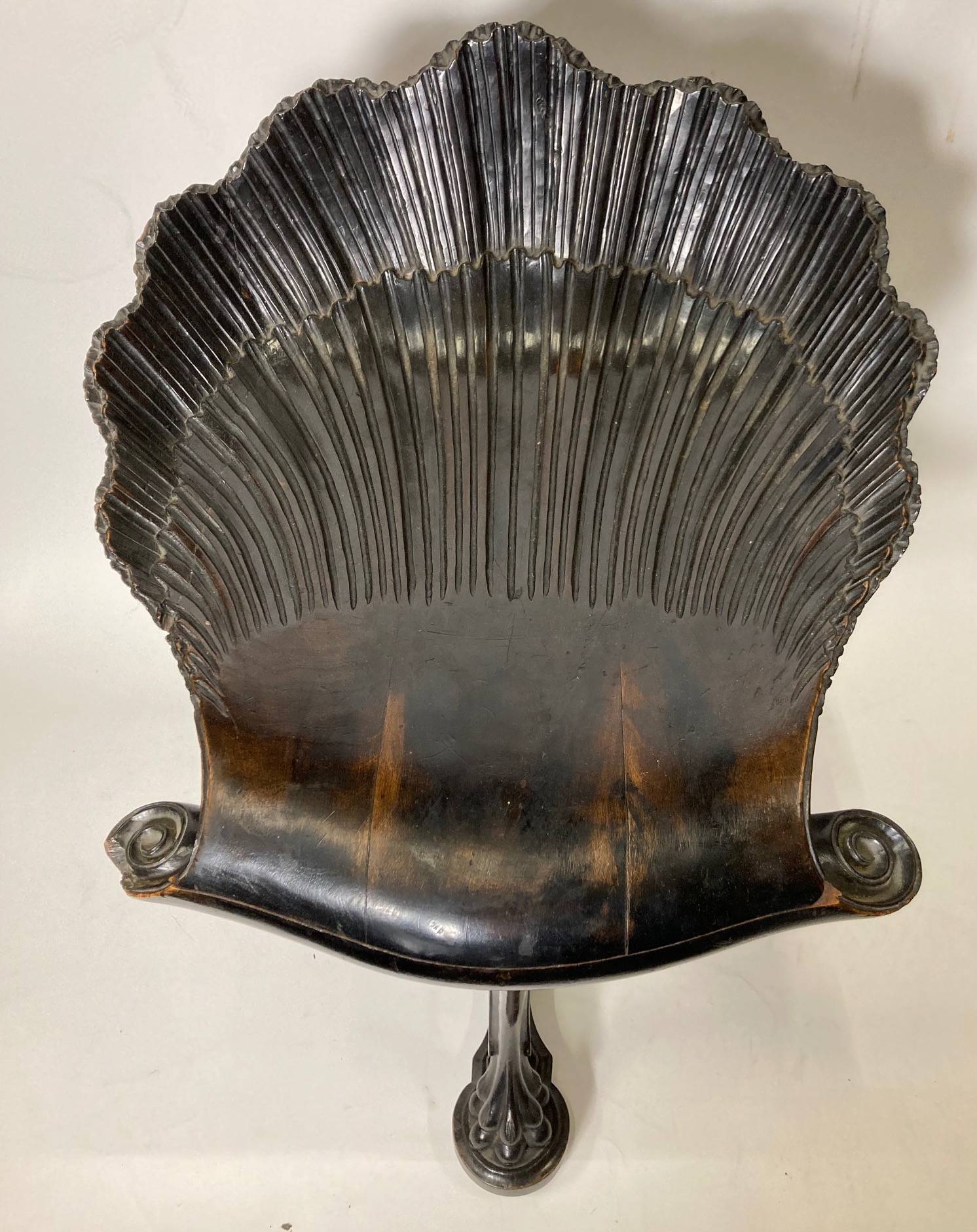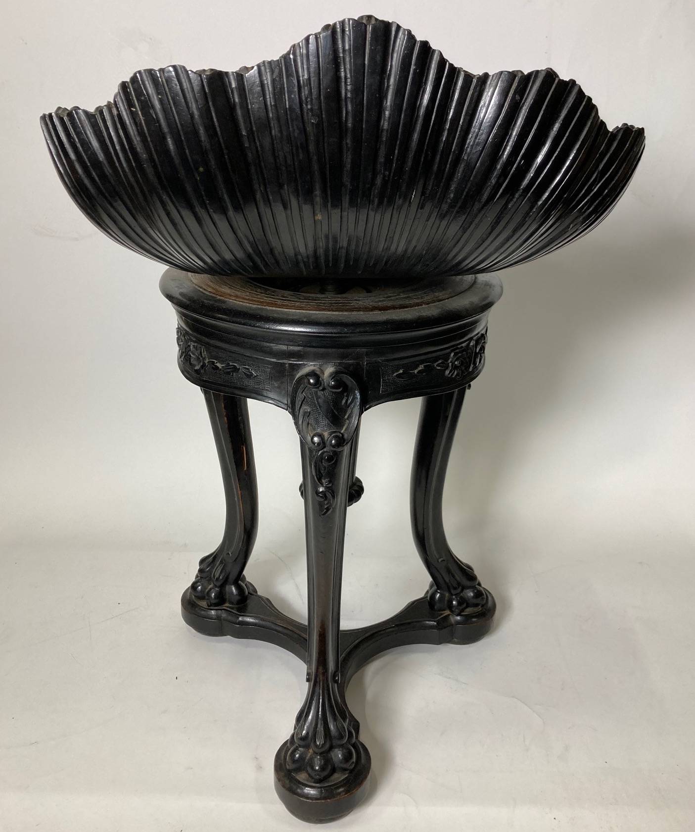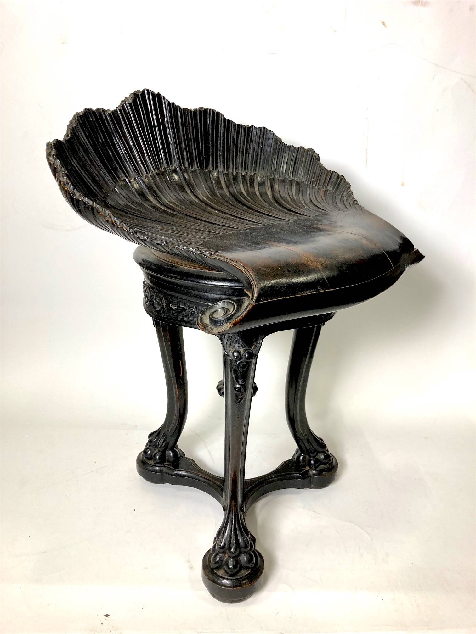 Tabouret de harpiste de forme coquille (XIXe). Trois pieds griffes. Bois de poirier noirci. Système rotatif pour la hauteur du musicien. Légers manques.