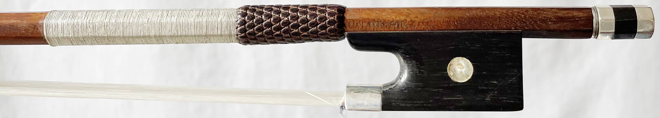 portant la marque au fer Collin-Mézin circa 1920. Baguette ronde en beau bois de pernambouc. Hausse ébène, monté argent.