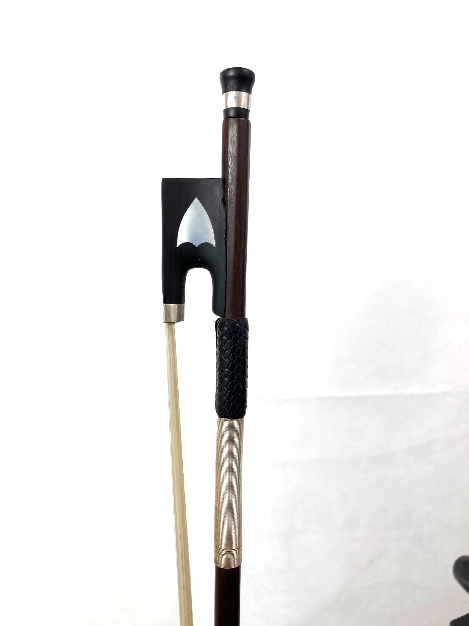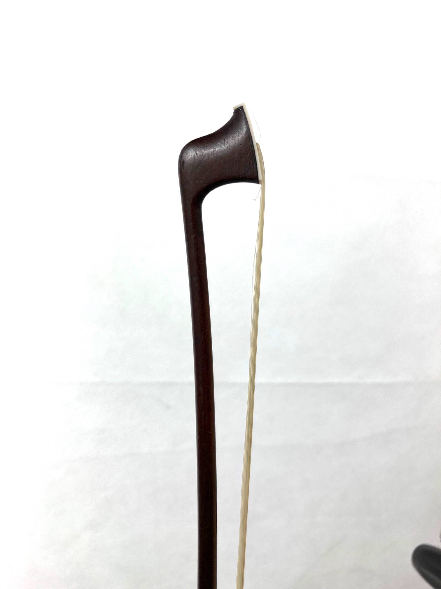Fait vers 1790. Baguette ronde en beau bois de pernambouc. Hausse en ébène, bois sur bois incrusté d'un écusson en nacre, monté argent. Bouton postérieur d'un autre auteur. Usure au pan sous la garniture. 712 mm. 60 g.