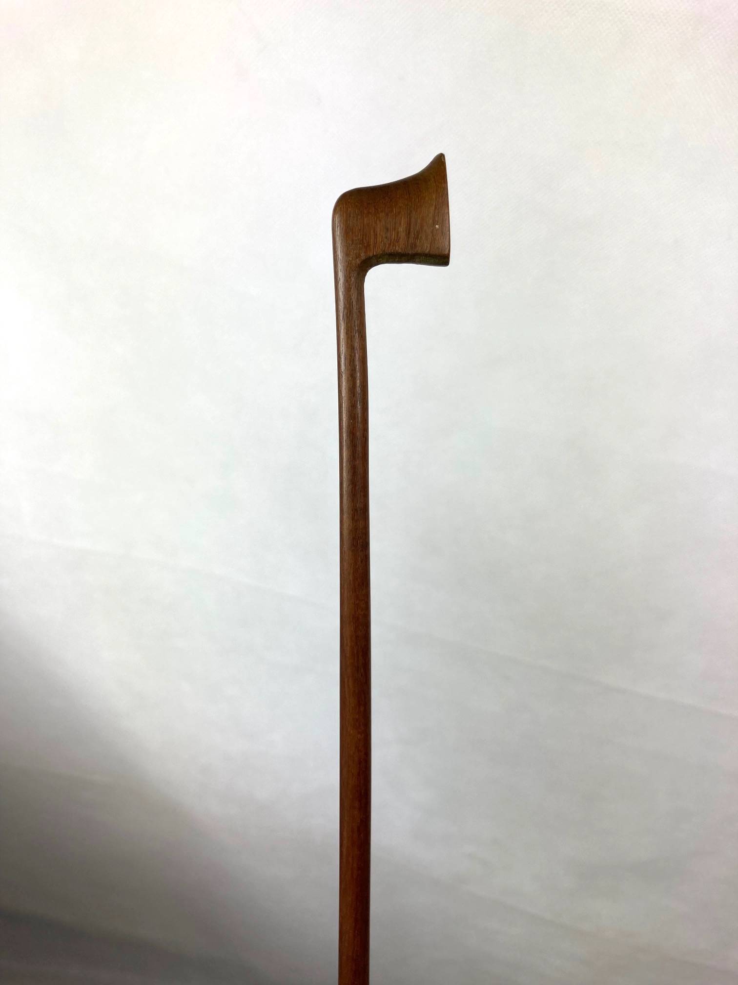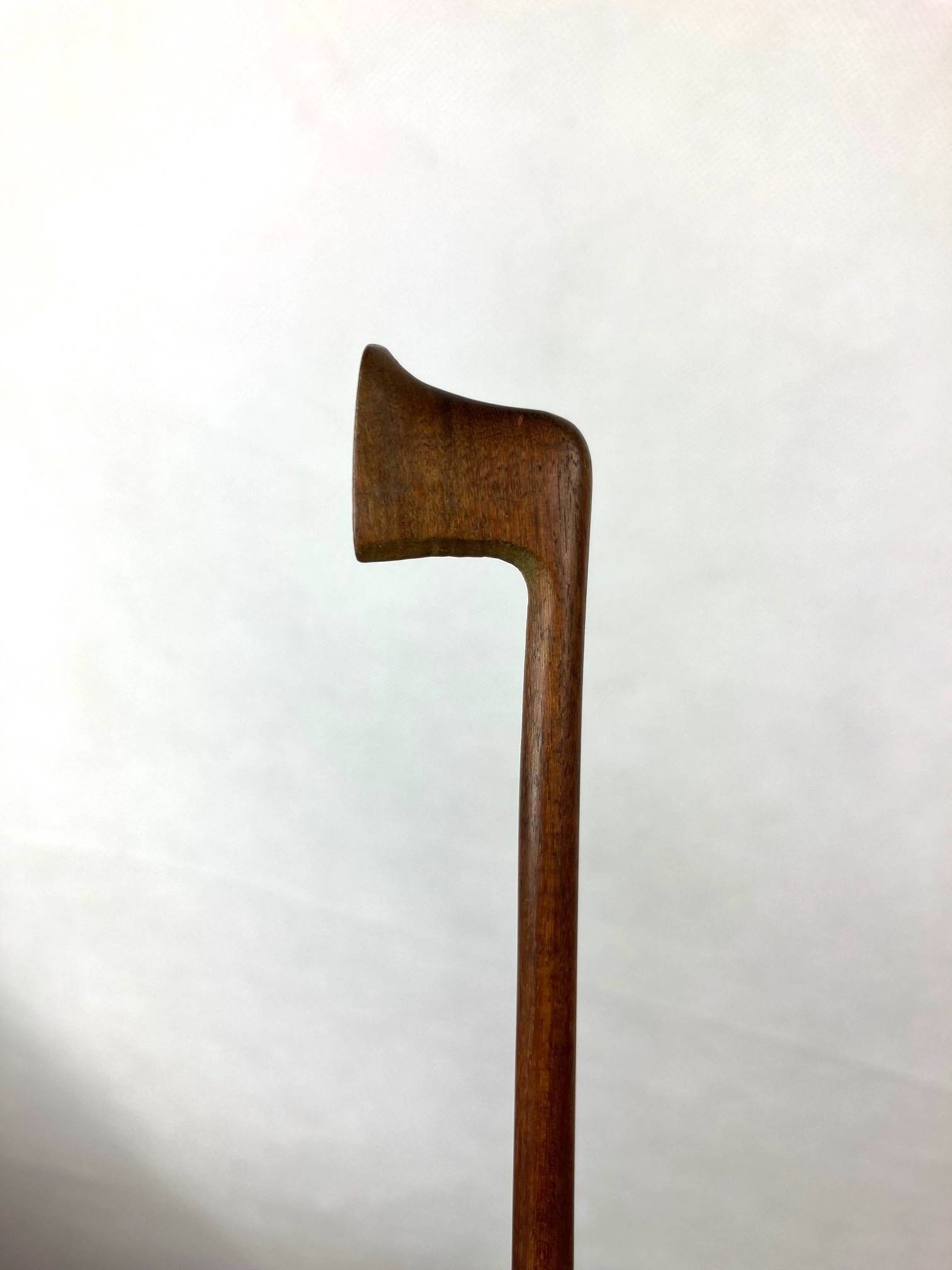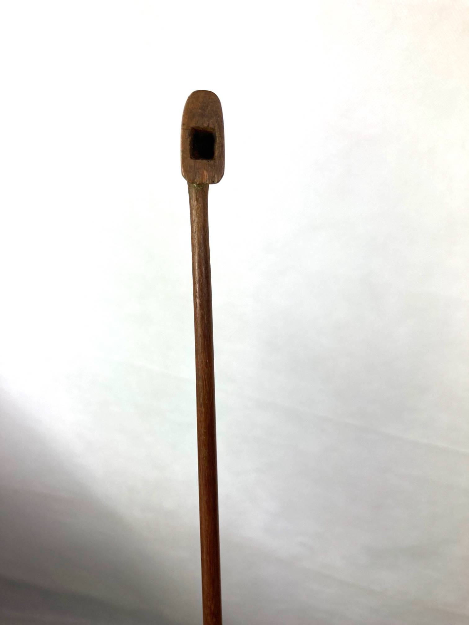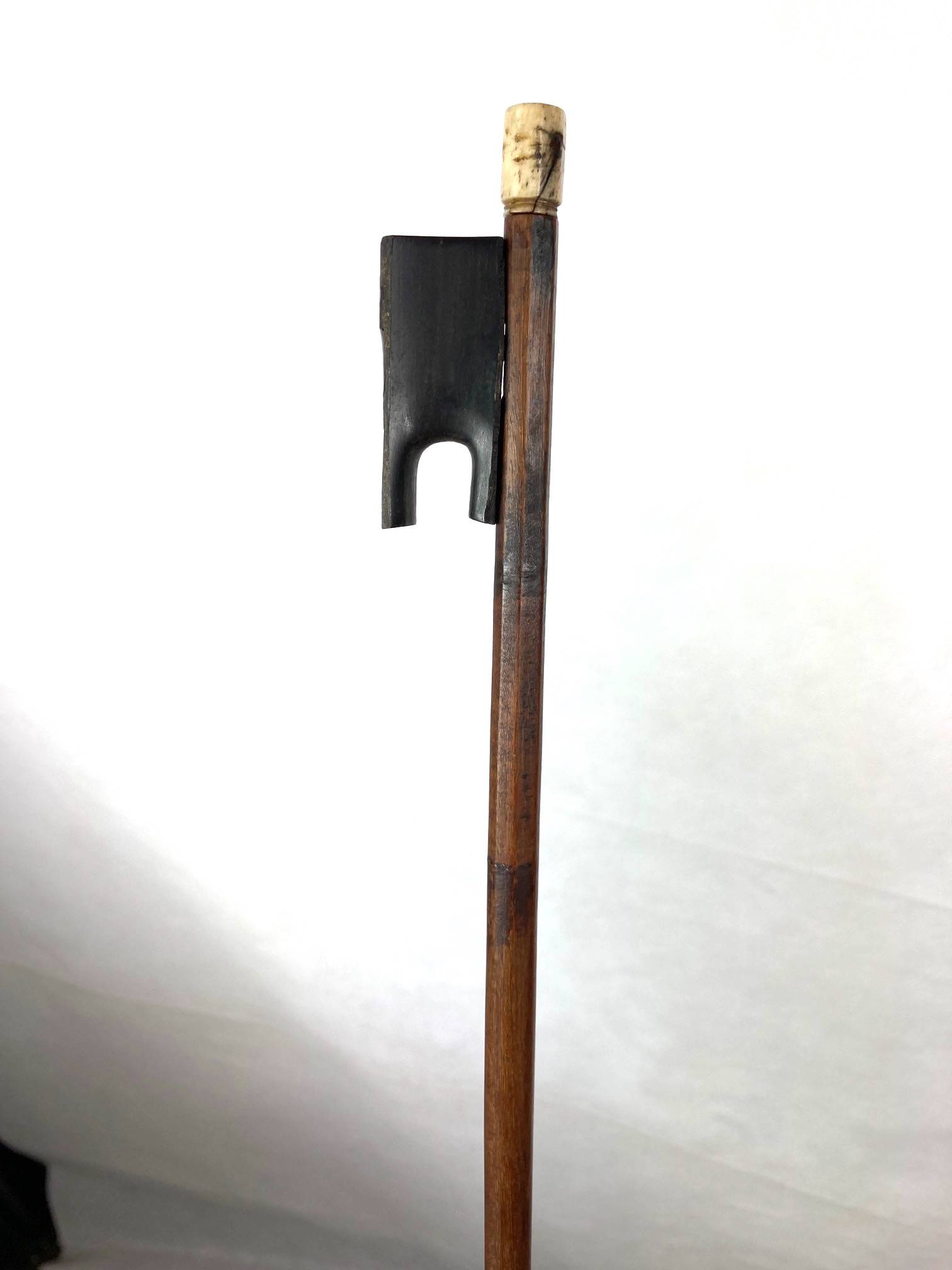 Baguette ronde en bois de pernambouc. Hausse ébène ouverte, bois sur bois. Bouton en os. A restaurer.