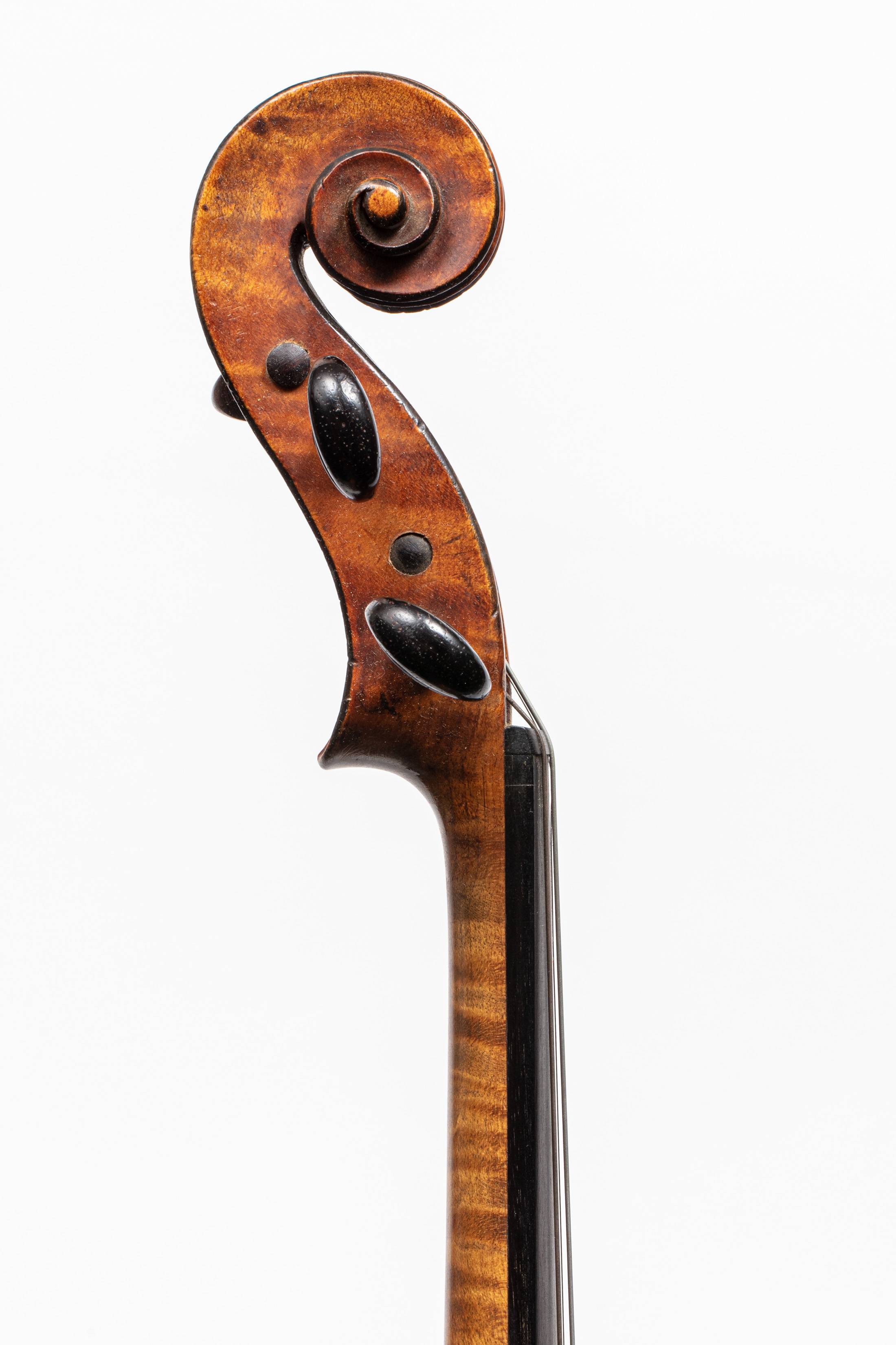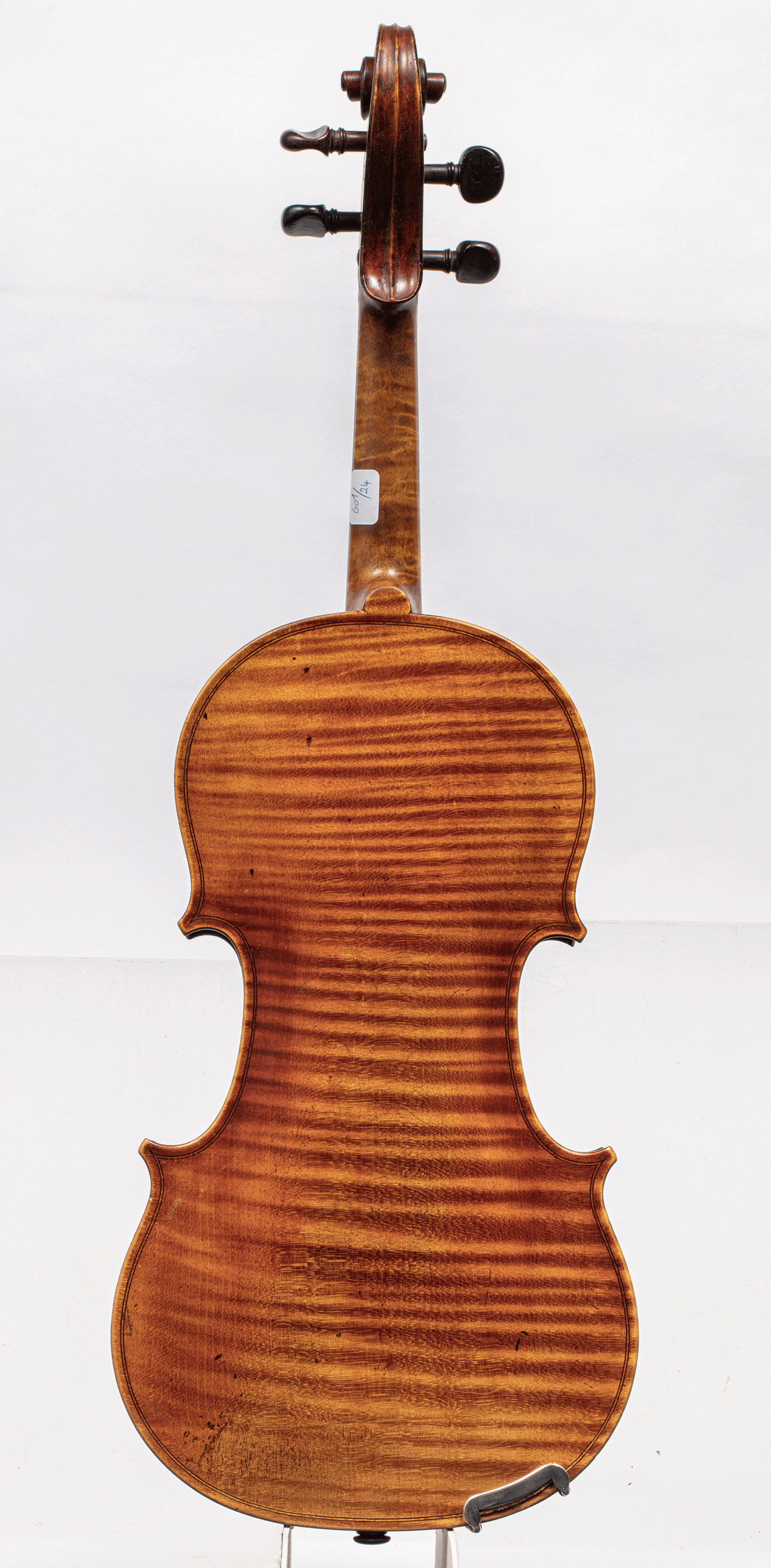 dont il porte l'étiquette "C.A MIREMONT"... Fond d'une pièce en érable, aux belles ondes régulières. Table en épicéa. Vernis brun doré. 362 mm.