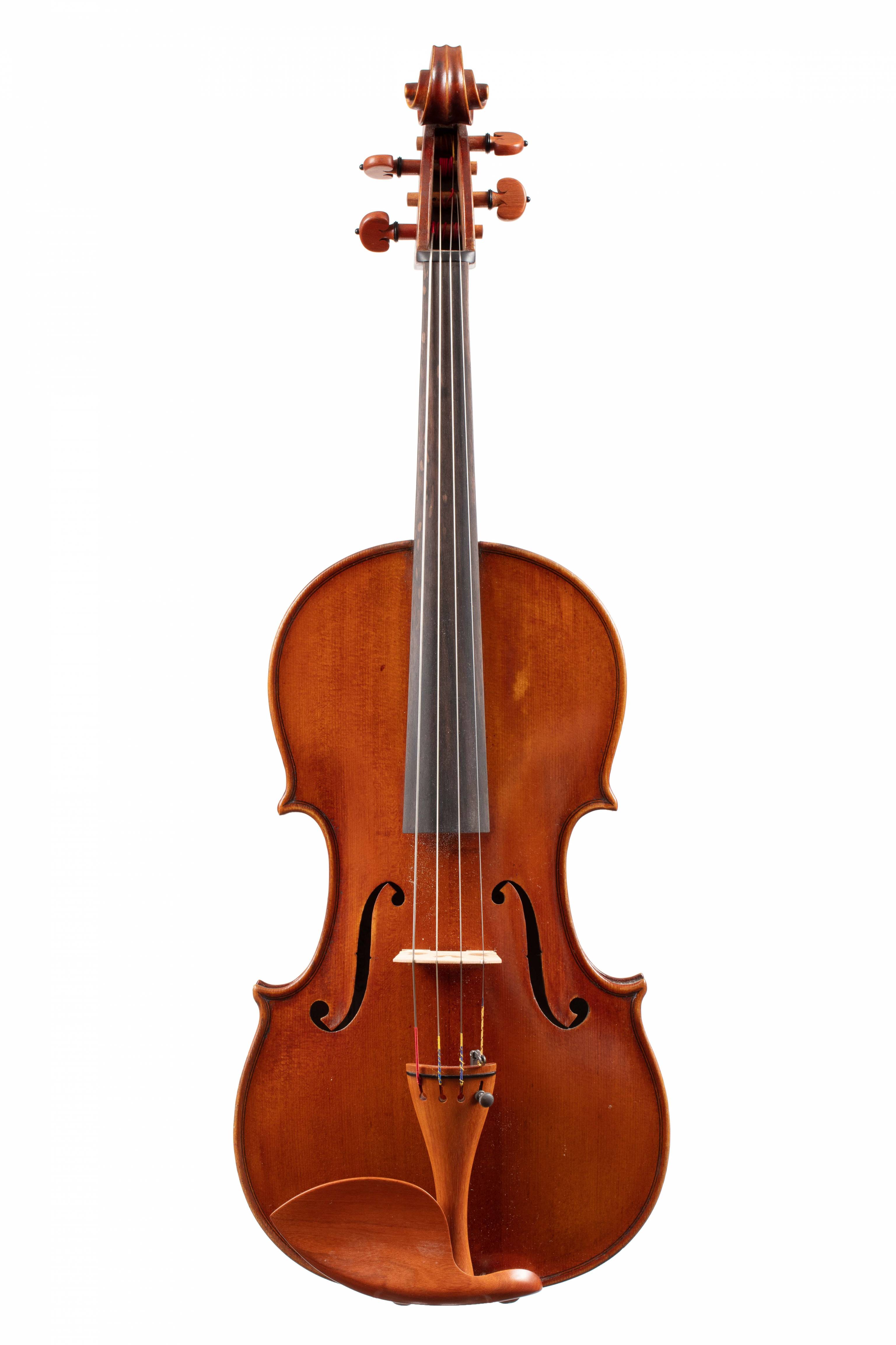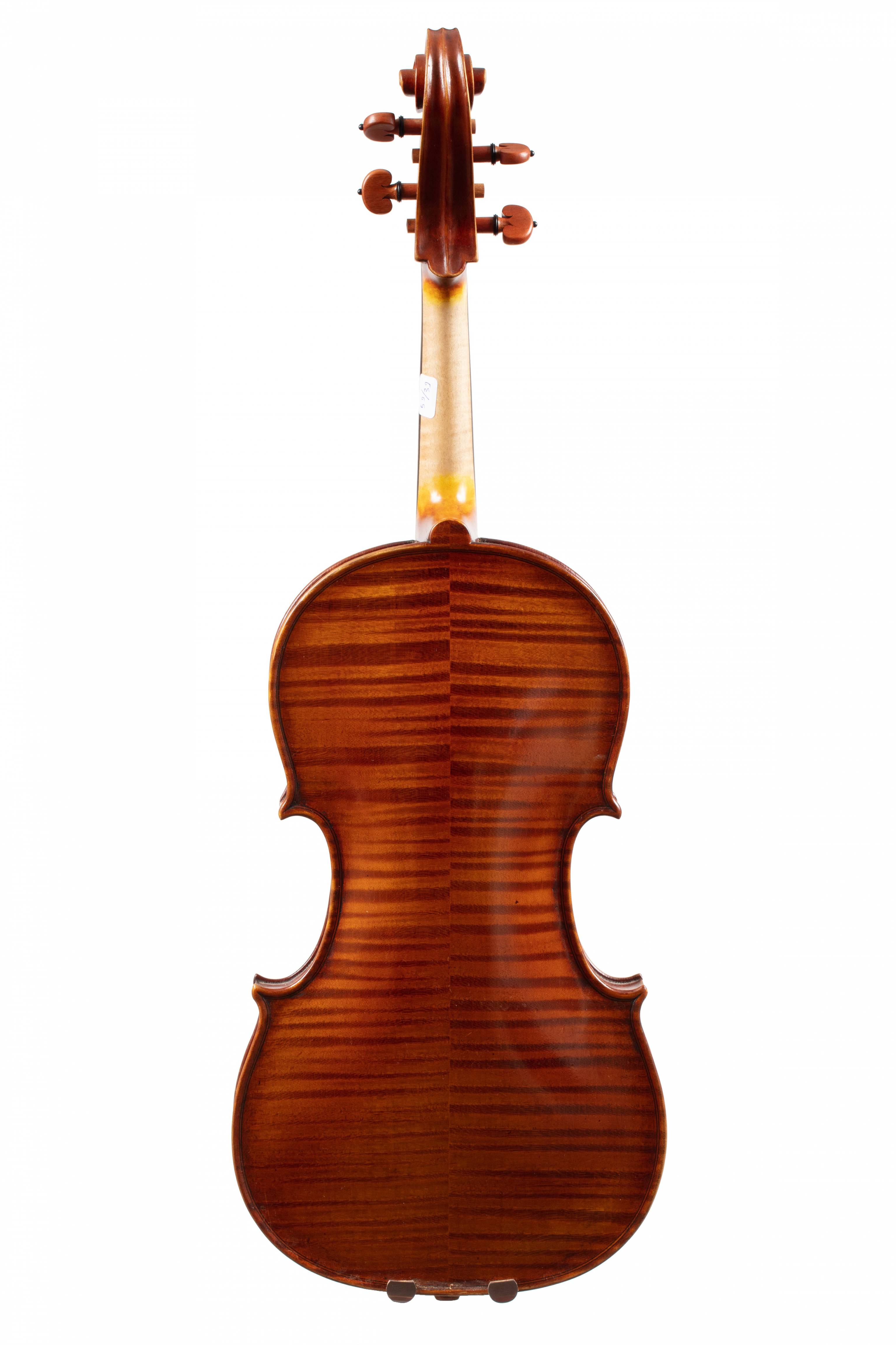dont il porte l'étiquette originale "PANIZZI Giovanni Battista Fece in SAN REMO anno 1933", et les marques au fer "G.B.PANIZZI". Fond de deux pièces en bel érable aux ondes régulières, horizontales. Table en épicéa aux pores réguliers. Vernis brun sur fond doré. 408 mm.