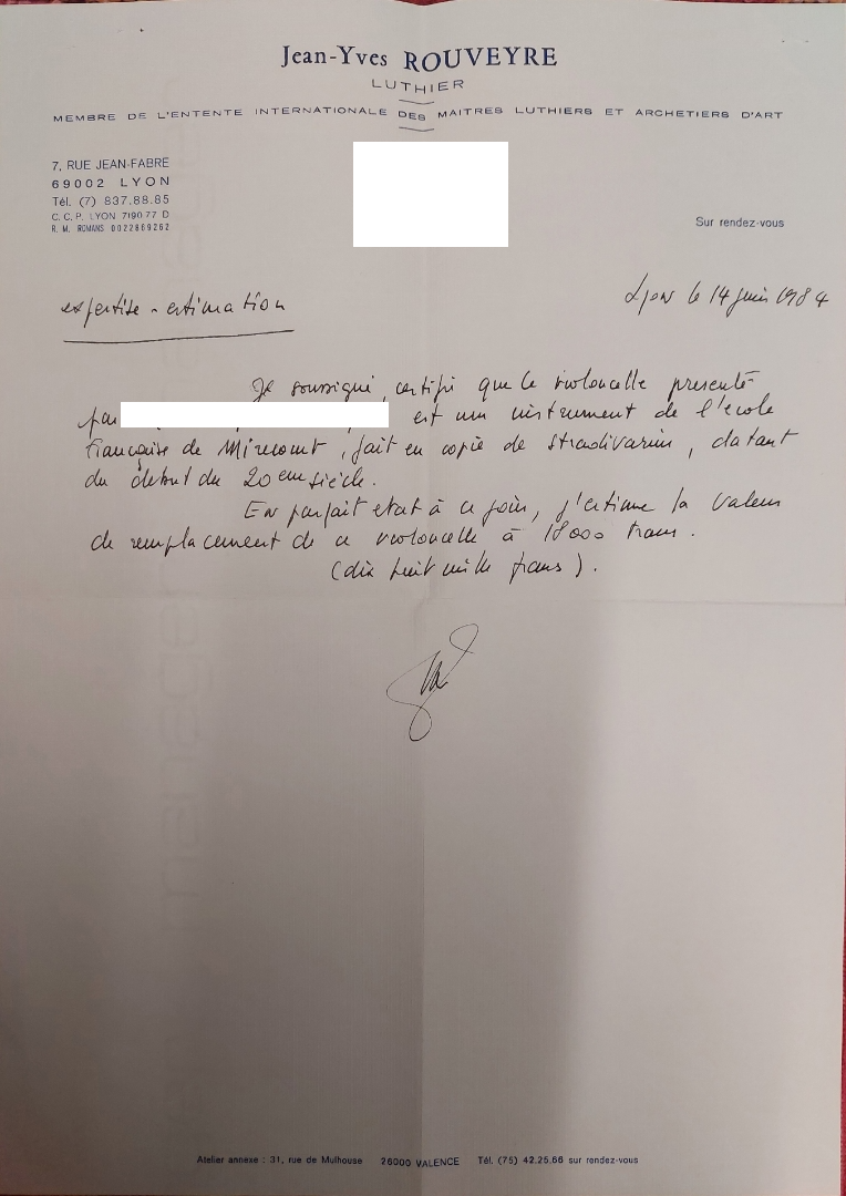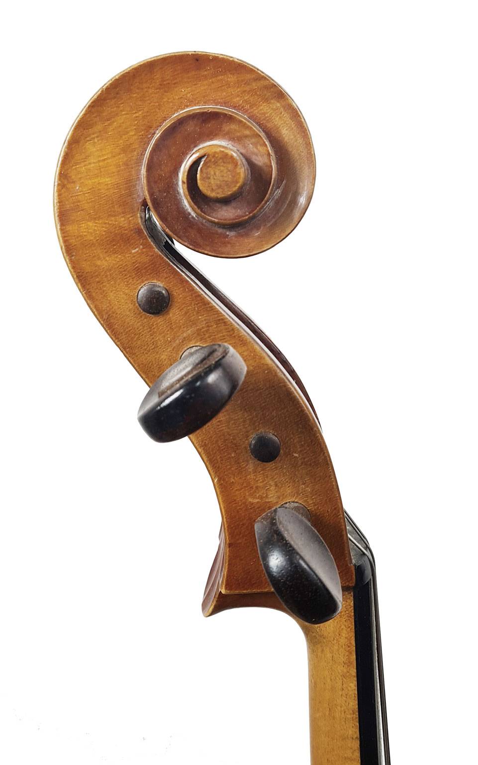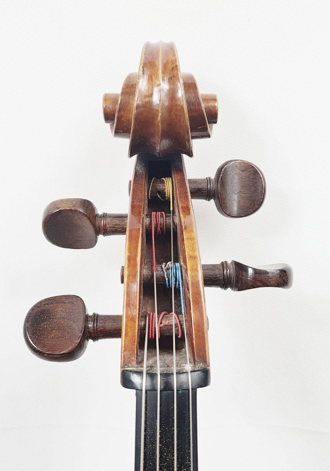 fait à Mirecourt, portant l'étiquette "Copie de Antonius Stradivarius 1721.". Fond de deux pièces en érable ondé. Table en sapin aux pores plutôt larges. Bon état général. (Quelques rayures)