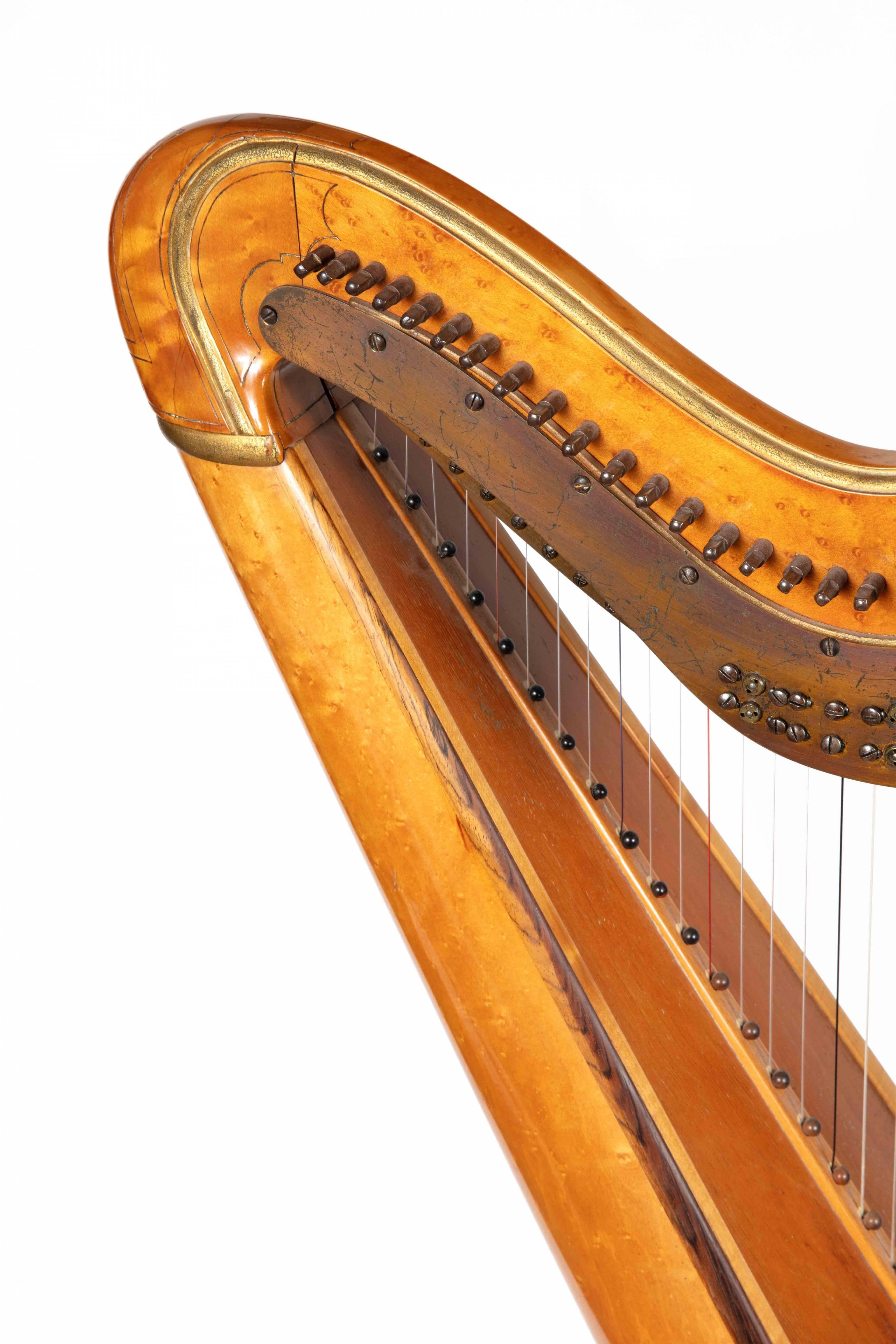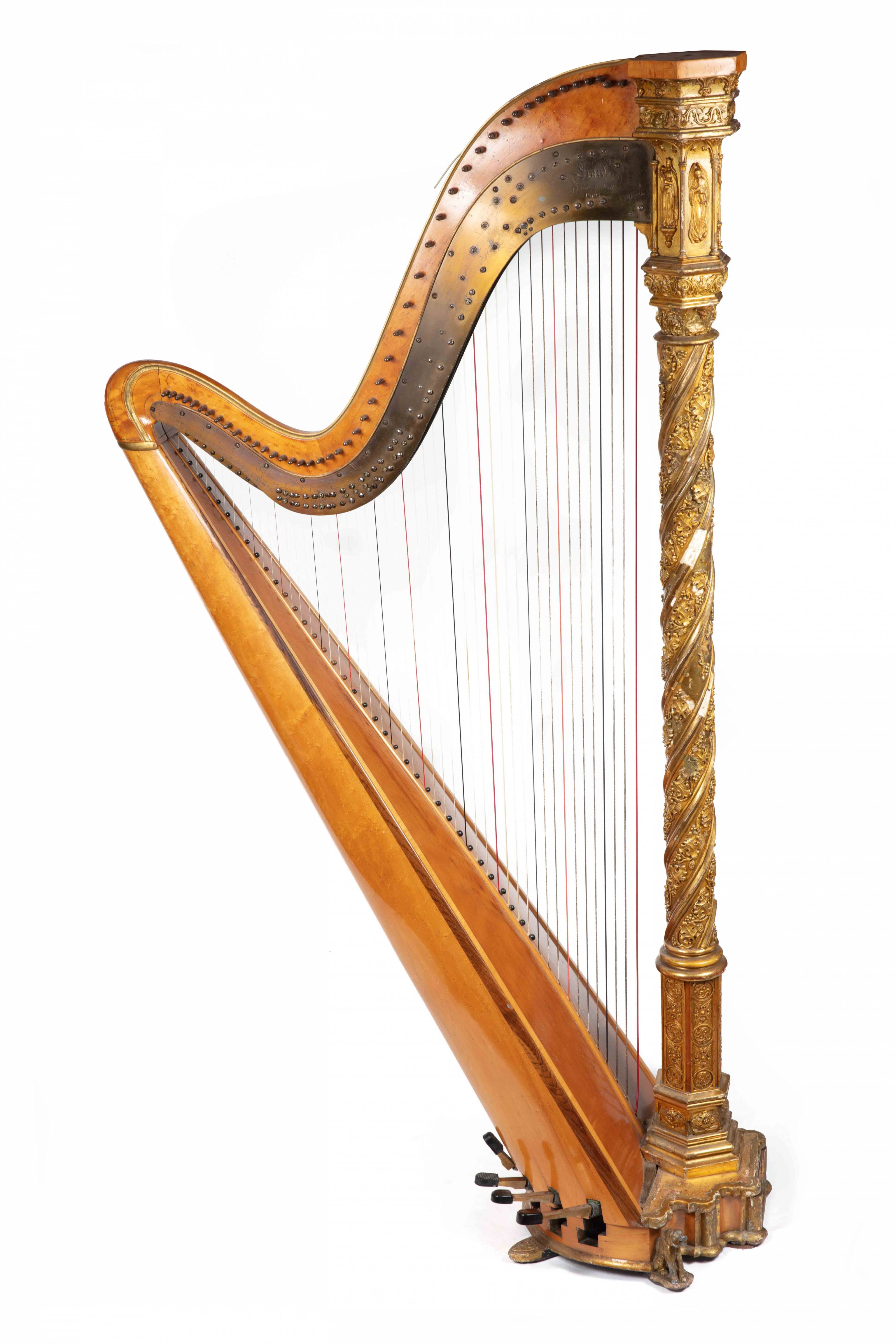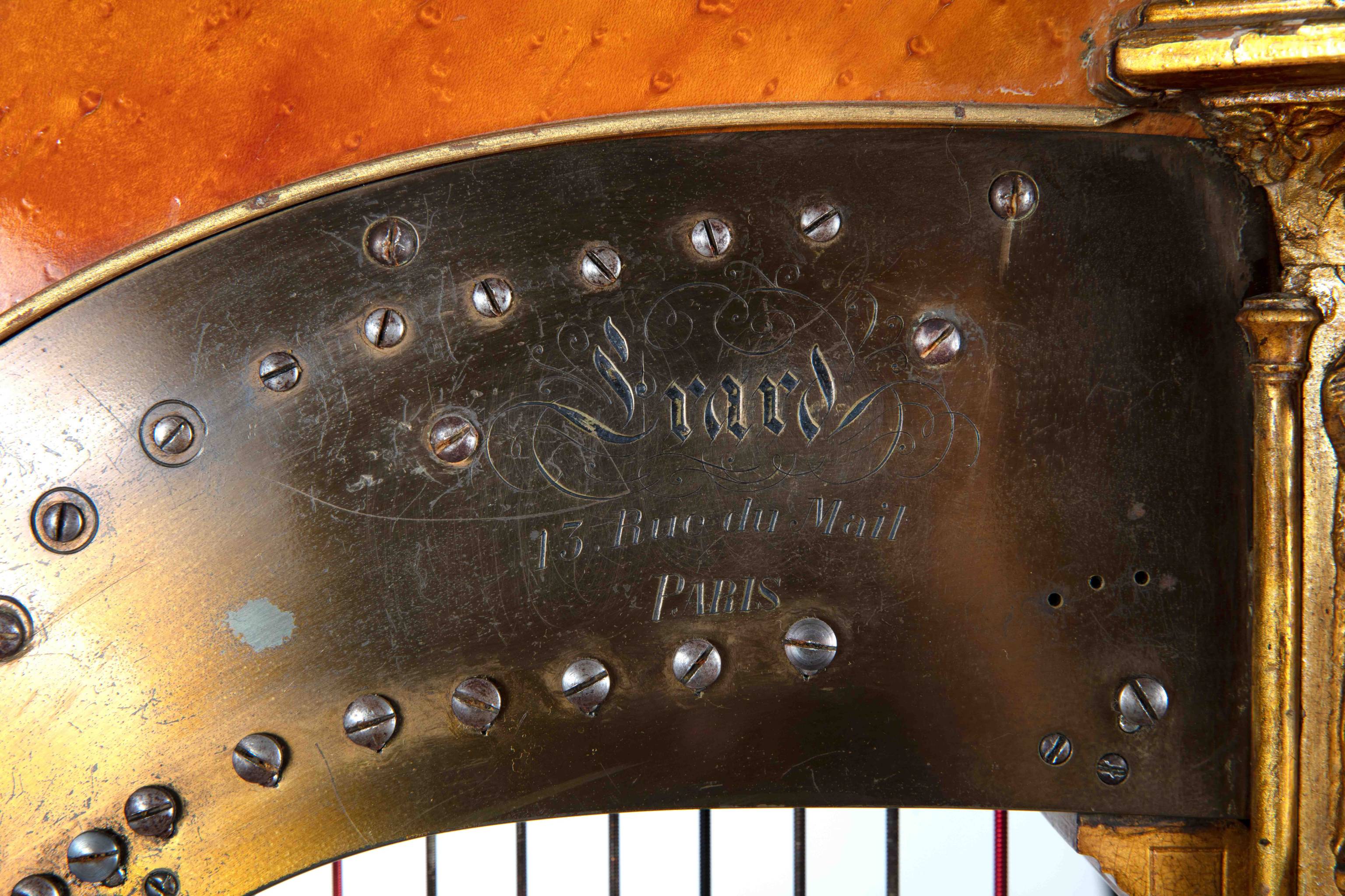de style néogothique à colonne torsadée marquée sur la console "ERARD / 13 rue du Mail / Paris". N° 3821 fabriquée au début du XXe. 47 cordes, mécanique à fourchettes et double mouvement, 7 pédales. Corps en érable.