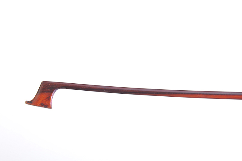 Archet de violon fait au début du XIXe siècle. Baguette ronde en bois exotique avec bague de pans. Hausse ouverte en ébène. Bouton en os. 725 mm 57,6 g sans mèche ni garniture.