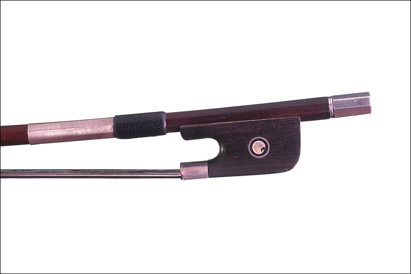 Archet de contrebasse fait par Louis Morizot père, dont il porte la marque au fer. Baguette ronde en pernambouc. Hausse ébène montée argent avec initiales gravées sur le passant. Bouton en argent plein. 67,5 cm.
