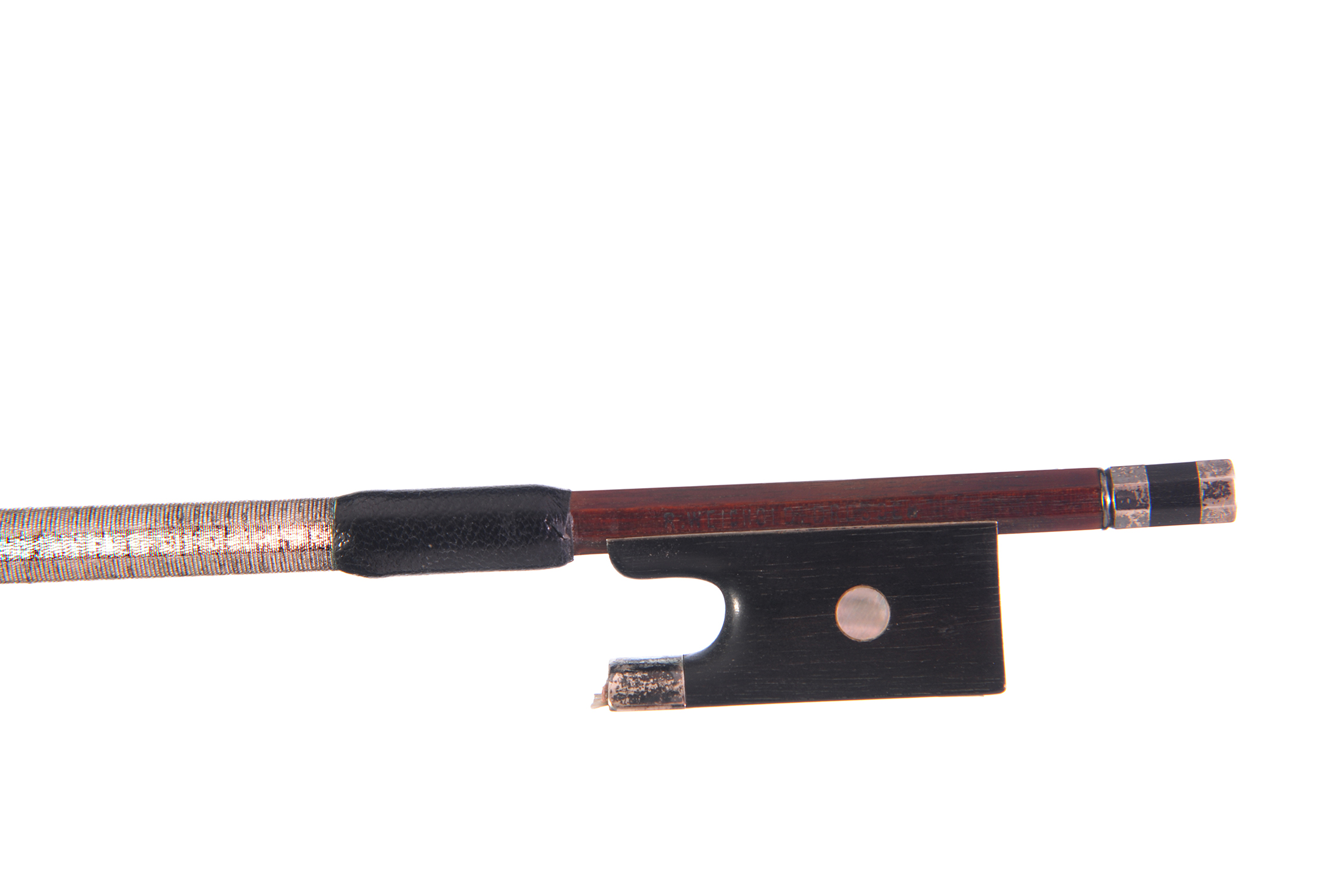 Archet de violon en pernambouc, baguette octogonale, montée argent. Il porte la marque au fer de R Weishold.