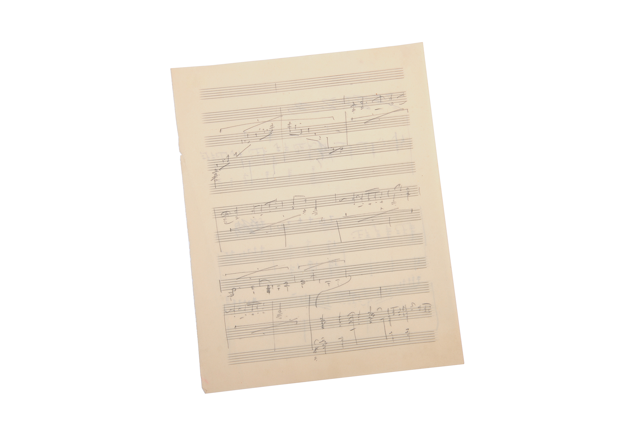Esquisse manuscrite du début du finale, troisième et dernier mouvement de la Sonate pour violon et piano, composée entre septembre 1916 et avril 1917 et dernière œuvre majeure du compositeur. Ainsi qu’il l’écrit à son éditeur en février 1917, Jacques Durand, Debussy a remanié à plusieurs reprises le « terrible finale » de cette sonate. Son ami, Paul Dukas, le conforte dans son travail début avril 1916 en lui affirmant : « entre vos six versions du finale de cette sonate il y en a cinq de bonnes et […] la sixième est excellente ». Cette esquisse, écrite recto verso au crayon à papier, avec deux mesures notées à l’encre au verso, témoigne des différentes versions envisagées par le compositeur. Elle offre les 26 premières mesures d’une version en 9/8 basée sur un motif déjà présent dans le premier mouvement. Provenance de la collection de Mme de Tinan (François Lesure, Catalogue de l'oeuvre de Debussy, n°140).