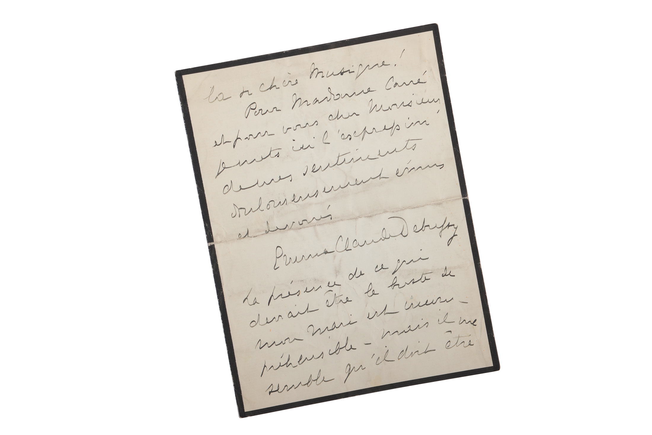 Emma DEBUSSY (1862-1934). Lettre autographe signée [ à Albert Carré]. c. 1920, 4 pp. in-8, papier deuil, encre noire. Belle et émouvante lettre de la veuve de Claude Debussy, qui dit ses sentiments de douleur et d'affliction, mais s'emporte aussi sur un projet de buste du « grand maître disparu ».