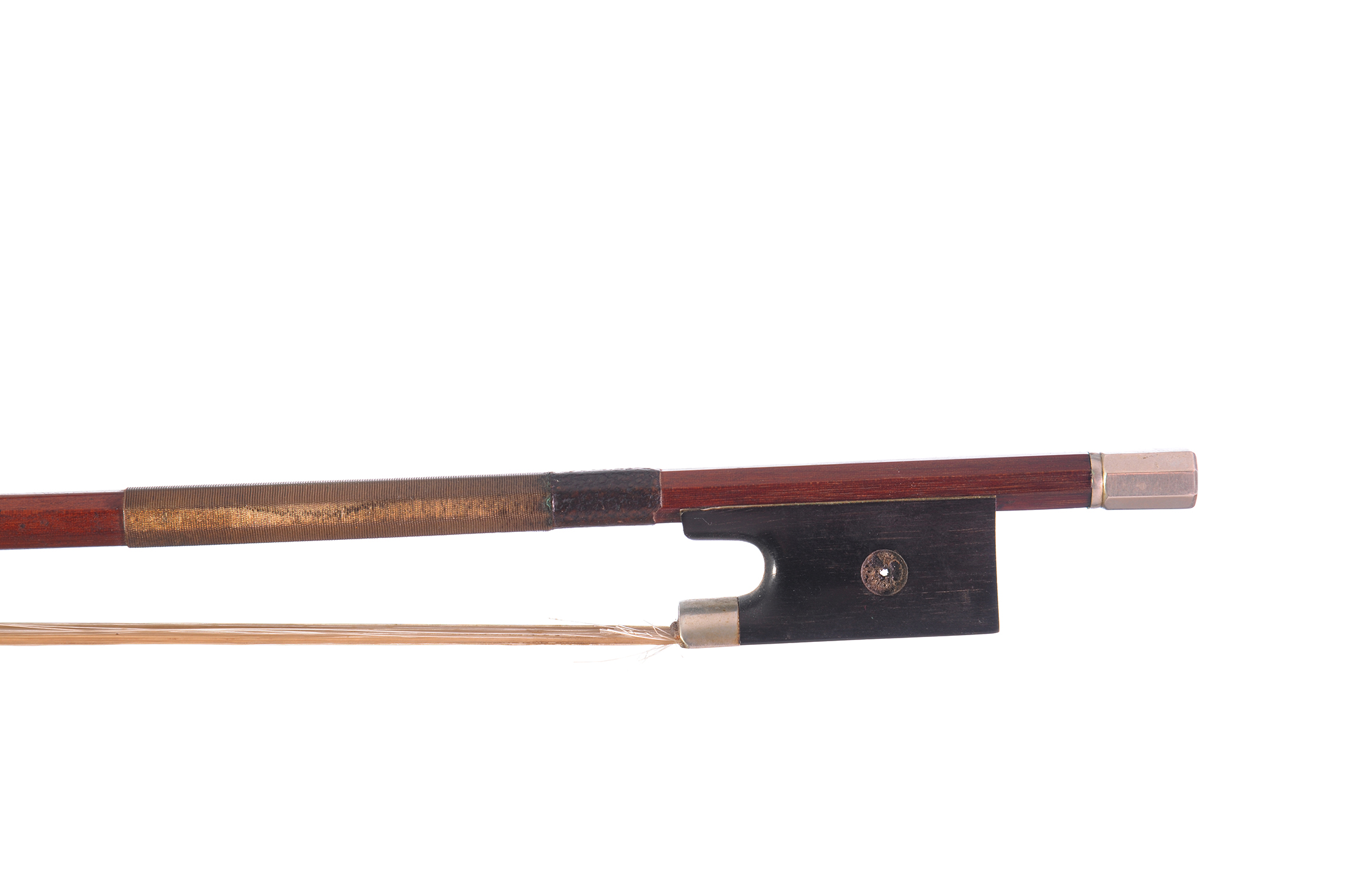 Archet de violon fait à Mirecourt dans le style de Bazin, baguette en pernambouc, hausse ébène montée maillechort, 728 mm.