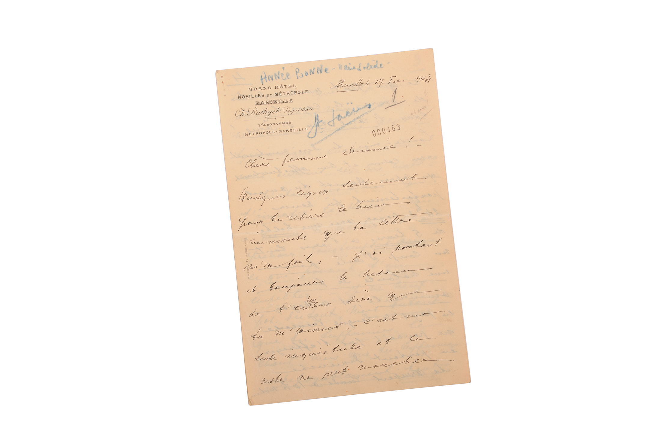 Superbe lettre du violoniste liégeois à son épouse : « Chère femme aimée ! Quelques lignes seulement...» qui se transforment en vingt-sept pages de forts reproches et de déclarations enflammées, ainsi que quelques anecdotes de voyage, souvenirs de concerts et de répétitions, propos sur Saint-Saëns... Transcription intégrale jointe.