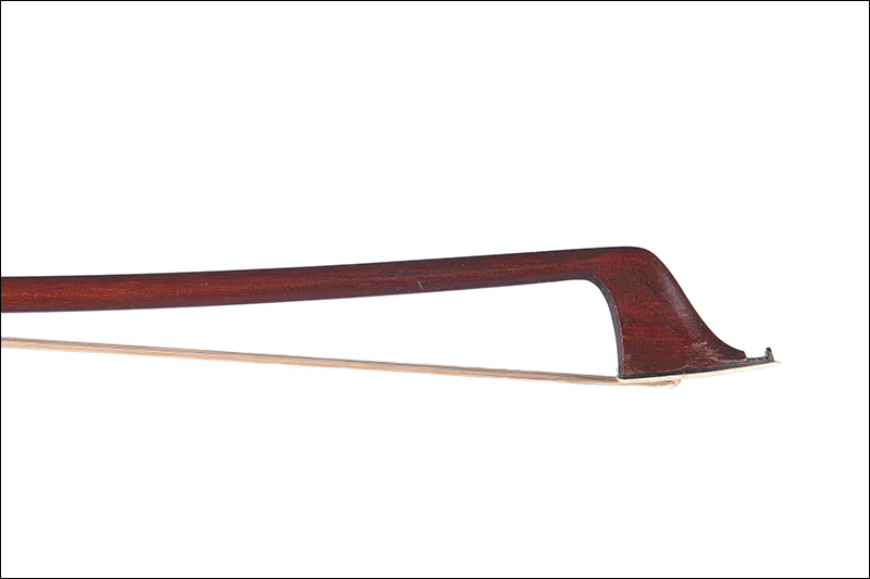 Archet de violoncelle allemand. Baguette en bois de pernambouc, abimée au bec. Cerclage aux pans. Hausse ébène montée maillechort. Bouton plein. 695 mm. 82,7g.