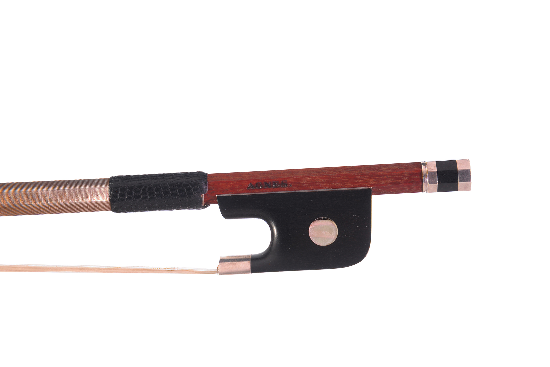 Archet de violoncelle fait par Agnès Saumagne, portant la marque au fer de AGNES. Baguette ronde en beau bois de pernambouc. Hausse ébène montée argent. 699 mm.